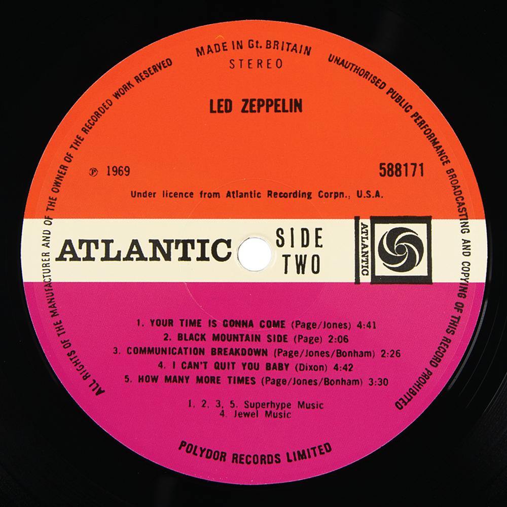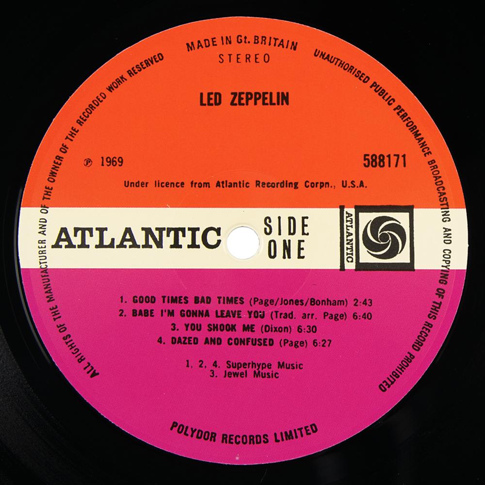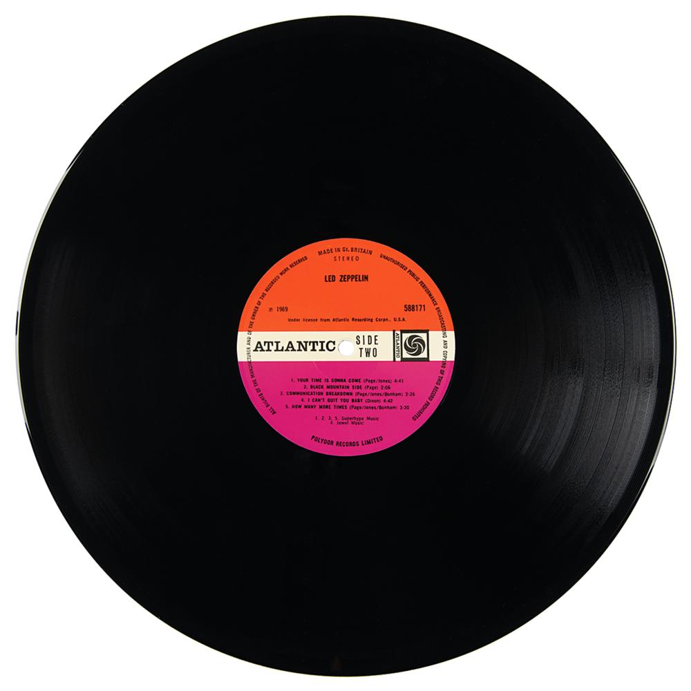 Never-released U.S. 2019 reissue sample album of Led Zeppelin’s self-titled debut studio album, (Atlantic Records, 588171, Stereo), which features turquoise blue lettering on the front cover and the spine marked as “Led Zeppelin, Atlantic 588 171”; spines of reproductions are left blank. The black vinyl features no matrix or runout numbers to the dead wax; some reproductions are pressed on different colored vinyl and list "LZ-A" and "LZ-B" on the corresponding sides of the dead wax, rather than the catalog number. In very fine condition. The record is included. An extremely rare Led Zeppelin reissue that never made it to the public market—only a few copies are known to exist.