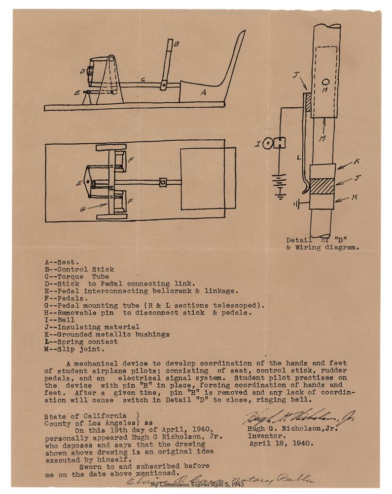 DS signed "Hugh G. Nicholson, Jr.," one page, 8.5 x 11, April 18, 1940. An original patent drawing, accomplished in ink and pencil, and typed description of a "mechanical device to develop coordination of the hands and feet of student airplane pilots." Notarized at Los Angeles, California, on April 19, 1940. In fine condition, with intersecting folds.