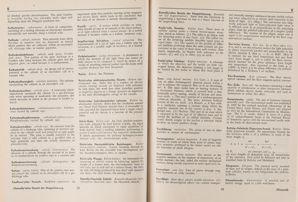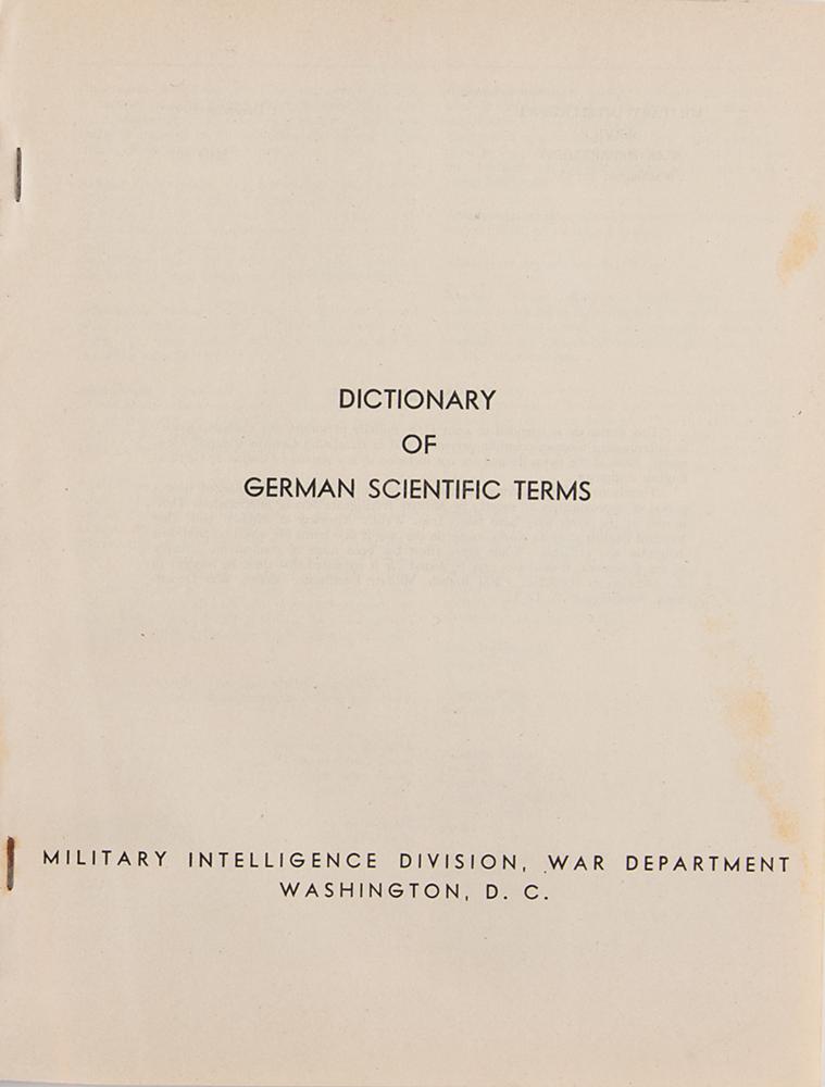 Booklet produced by the U.S. War Department’s Military Intelligence Division entitled “Dictionary of German Scientific Terms,” (MID 641), dated December 1, 1945, marked “Restricted” twice on the front cover, 169 pages, 8 x 10.25, containing a meticulous alphabetic collection of German science terms with their English translation and definition. An introductory notice reads, in part: “This dictionary is intended to assist U.S. military personnel and research agencies in interrogating German scientific personnel and in translating German scientific documents. Most of the terms defined are not included in any standard German or German-English dictionary.” In fine condition, with some light dampstaining to front cover and first page. An intriguing postwar document related to America’s salvaging of German researchers, a group that eventually included rocket scientist Wernher von Braun and a hundred of his key V-2 rocket personnel that emigrated to the United States in Operation Paperclip, where their knowledge was leveraged in the development of the Redstone missile.