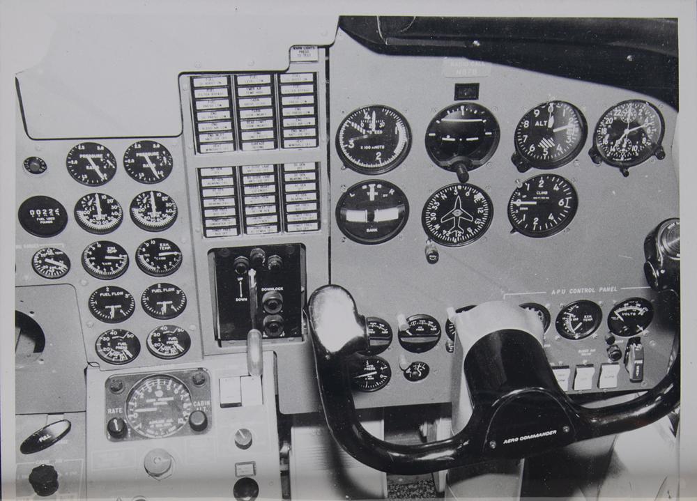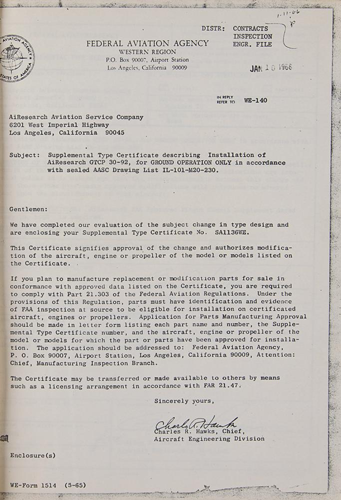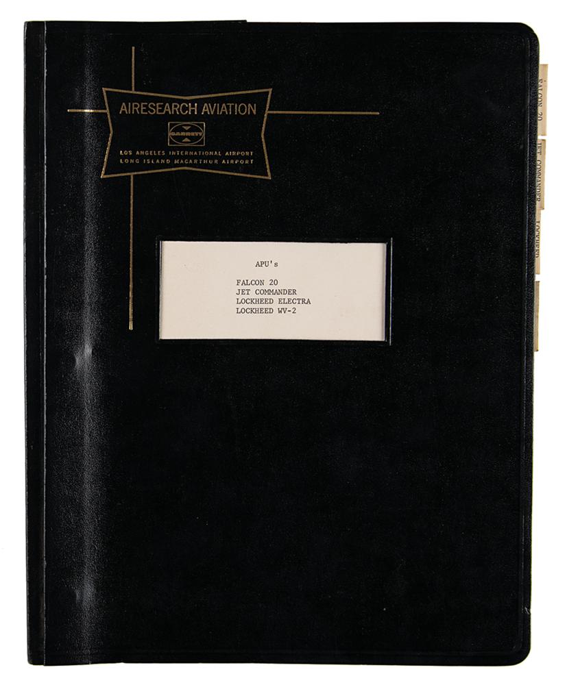 AiResearch Aviation binder containing documents and photographs affiliated with the Dassault Falcon 20, Aero Commander Jet Commander, Lockheed Electra, and Lockheed WV-2, circa late 1960s. The binder contains copies of Federal Aviation Agency supplemental certificates and a total of twelve original glossy photographs of aircraft components. In fine condition.
