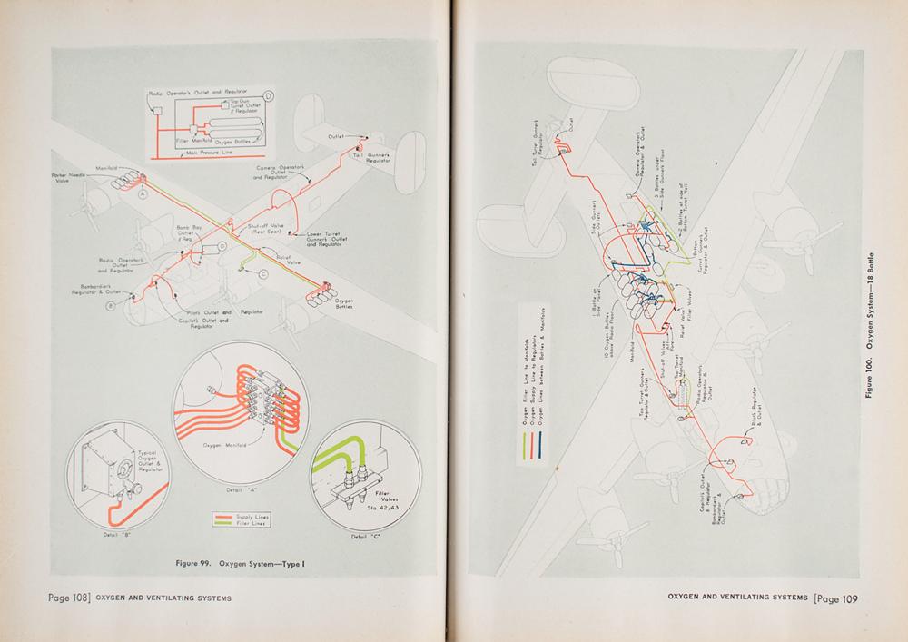 Hardcover book entitled "Service and Instruction Manual, Airplane General, B-24 Bombardment Airplane, Second Edition," by the Consolidated Vultee Aircraft Corporation, 8.5 x 11.25, 280 pages, published in 1944. The handbook covers the aircraft in general, wing and tail group, moveable surfaces and controls, fuselage, anti-icer system, oxygen and ventilation systems, fire extinguisher system, heater system, fuel system, landing gear, wheels, and lubrication system. The book is filled with instructions, procedures, schematics, and imagery for the B-24's various systems. In fine condition.