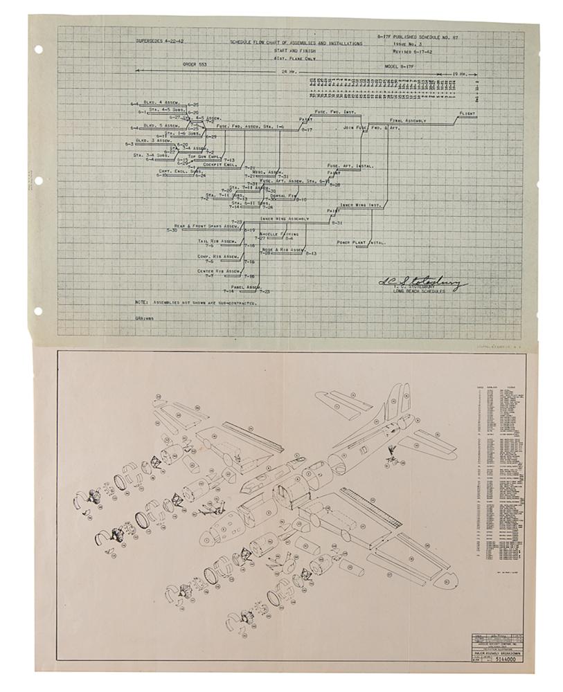 Original World War II-dated production illustration for the B-17 Flying Fortress, 16.5 x 11, produced by the Douglas Aircraft Company of Long Beach, California, dated February 1942 and numbered “5144000,” and depicting a "Major Assembly Breakdown” of a “B-17F” in a detailed exploded view of its 134 parts, which are itemized in a list on the right side. Included with the diagram is a copy of “B-17F Published Schedule No. 87,” Issue No. 3, revised June 17, 1942, 16.75 x 11, which features a “Schedule Flow Chart of Assemblies and Installations, Star and Finish, 41st Plane Only.” In overall fine condition, with vertical folds and light toning.