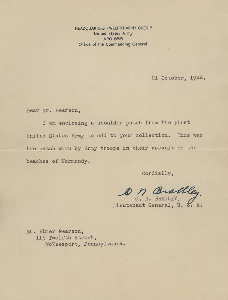 An embroidered 2.25″ x 3″ patch of the First United States Army insignia, presented with a World War II-dated TLS signed “O. N. Bradley,” one page, 6 x 8, Headquarters Twelfth Army Group letterhead, October 21, 1944, addressed to Elmer Pearson, in full: “I am enclosing a shoulder patch from the First United States Army to add to your collection. This was the patch worn by Army Troops in their assault on the beach of Normandy.” In fine condition. Accompanied by the original mailing envelope.