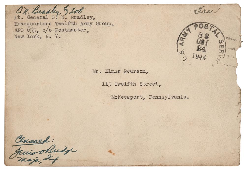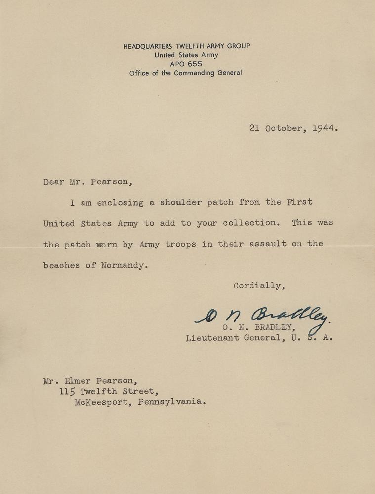 An embroidered 2.25″ x 3″ patch of the First United States Army insignia, presented with a World War II-dated TLS signed “O. N. Bradley,” one page, 6 x 8, Headquarters Twelfth Army Group letterhead, October 21, 1944, addressed to Elmer Pearson, in full: “I am enclosing a shoulder patch from the First United States Army to add to your collection. This was the patch worn by Army Troops in their assault on the beach of Normandy.” In fine condition. Accompanied by the original mailing envelope.