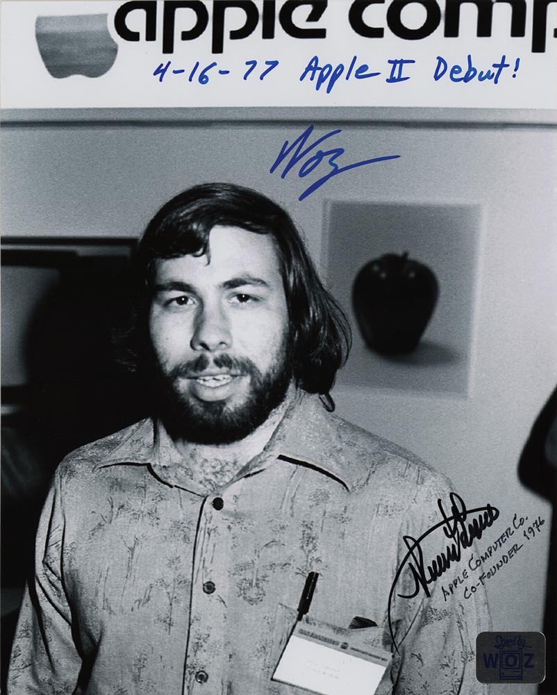 Satin-finish 8 x 10 photo of Steve Wozniak at the first West Coast Computer Faire, signed in blue felt tip, "4-16-77, Apple II Debut! Woz," and in black felt tip, "Ronald G. Wayne, Apple Computer Co. Co-Founder 1976." In fine condition.