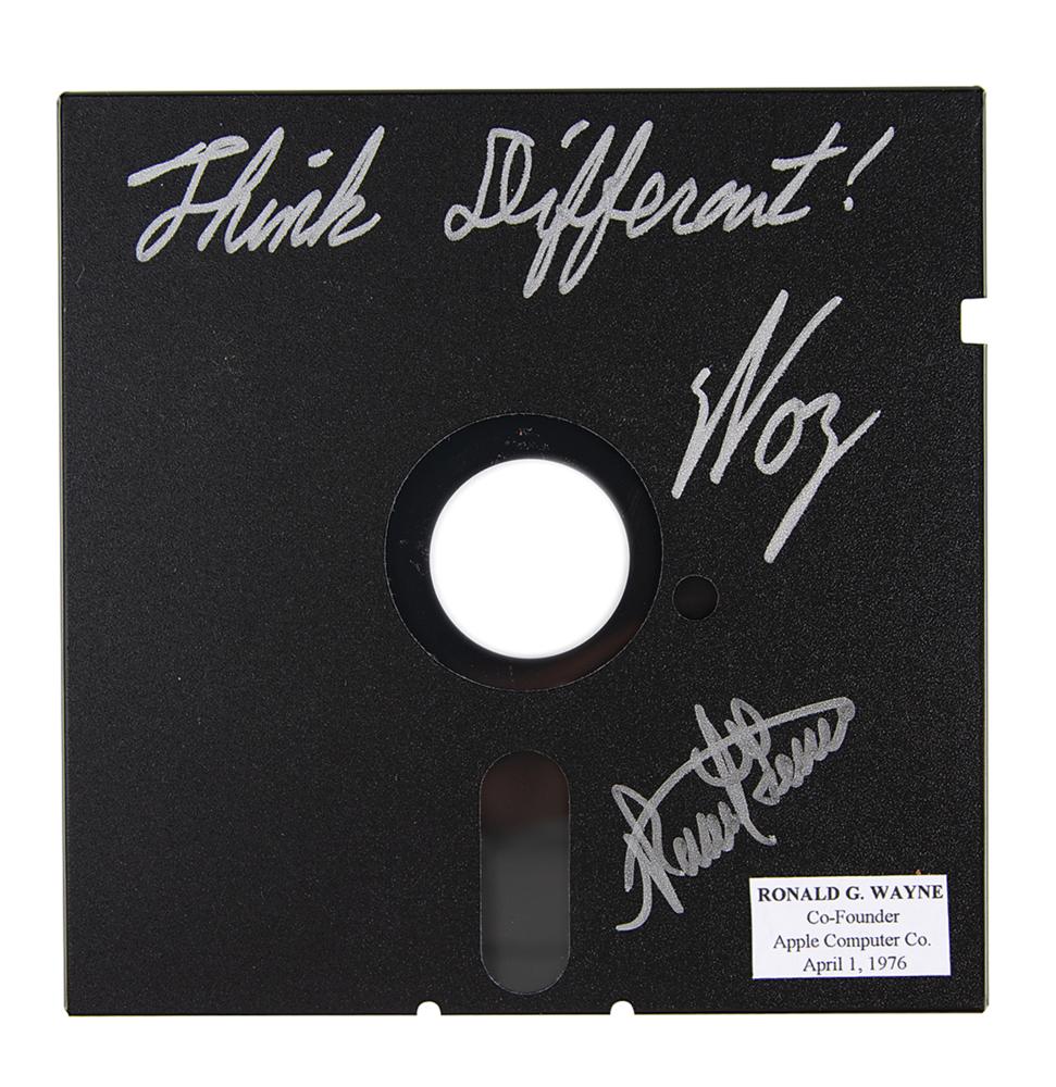 Black 5.25″ floppy disk, signed in silver ink by the Apple co-founders, "Think Different! Woz," and "Ronald G. Wayne." In fine condition, with Wayne's small biographical label affixed above below signature.