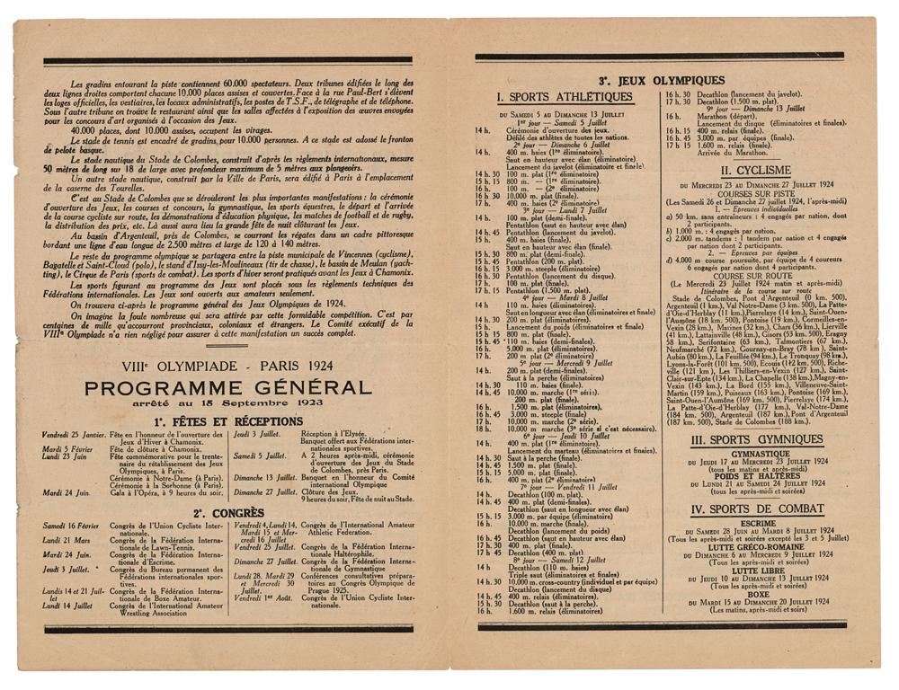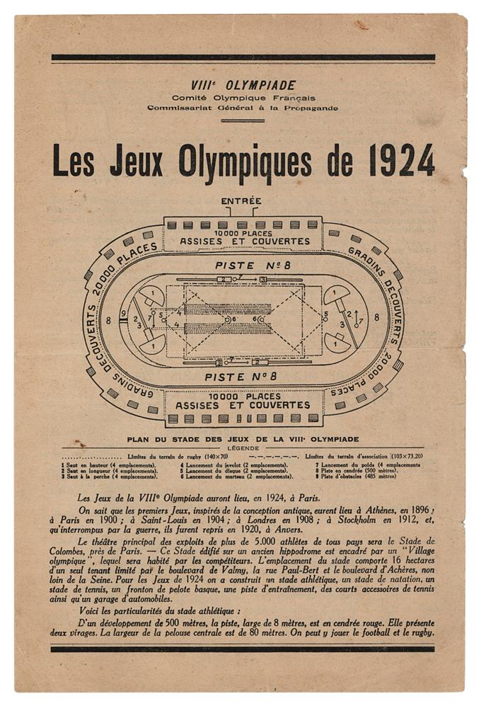 Original program of events for "Les Jeux Olympiques de 1924," the Paris 1924 Summer Olympic Games, four pages, 7 x 10.5, featuring a diagram of the Olympic stadium and a listing of the competition schedule, to include athletics, cycling, gymnastics, swimming, equestrian. and more. In very good to fine condition, with a central horizontal fold, light scattered creases, and several small edge tears.