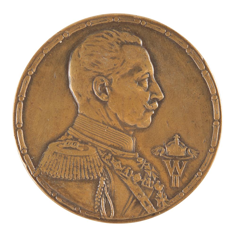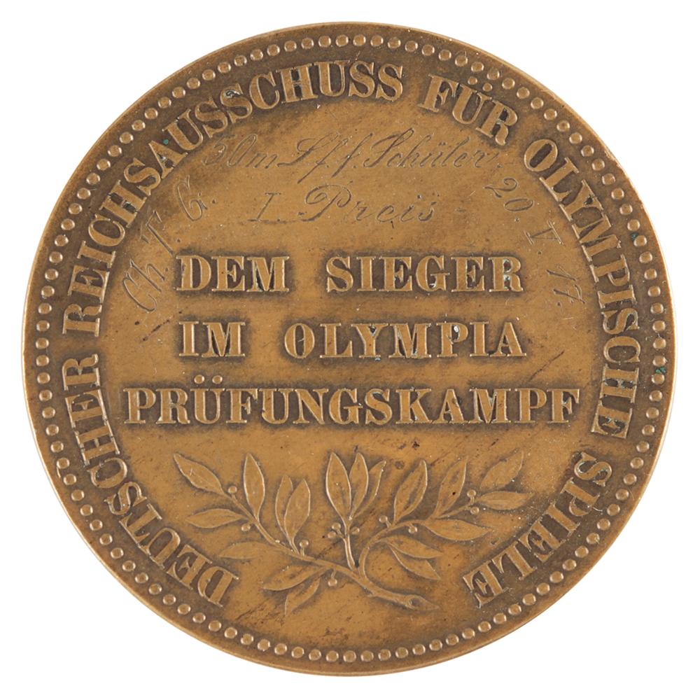 Winner’s medal issued for the German Olympic trials prior to the canceled Berlin 1916 Summer Olympics. Bronze, 50 mm, 54 gm. The front features a bust of Kaiser Wilhelm II of Germany; the reverse reads (translated), “The Winner in the Olympic Trial Contest,” with “The German Committee for the Olympic Games” around the perimeter. Hand-engraved above the legend with the event and winner's name, "50m L. F. Schuler." The 1916 Olympics were scheduled to be held in Berlin, Germany, but were eventually canceled due to the outbreak of World War I. Any memorabilia related to the 1916 Olympiad is thus quite uncommon.