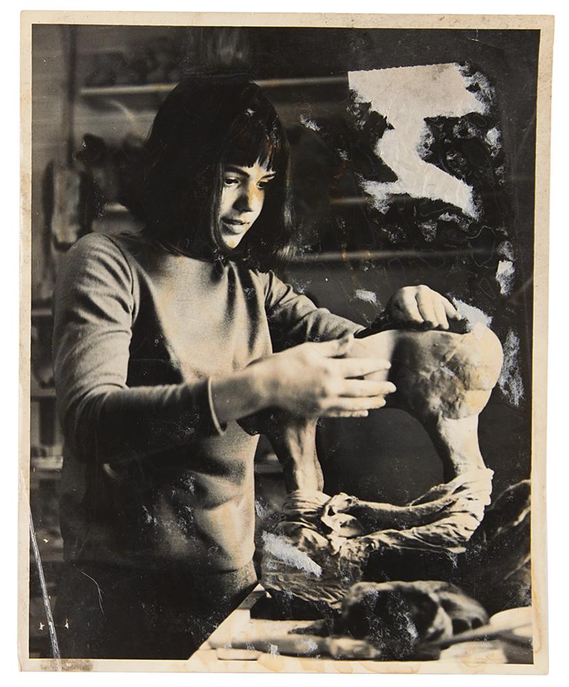 Rare original glossy 8 x 10 silver gelatin photo of Edie Sedwick working on her beloved clay horse in the Cambridge art studio of her cousin Lily Swann Saarinen. In very good condition, with scattered stains and creases, remnants of adhered paper, and instances of emulsion irregularity.