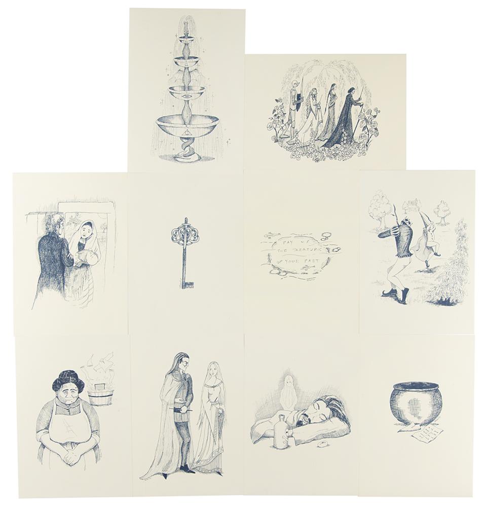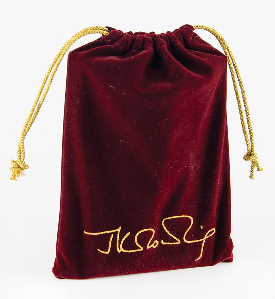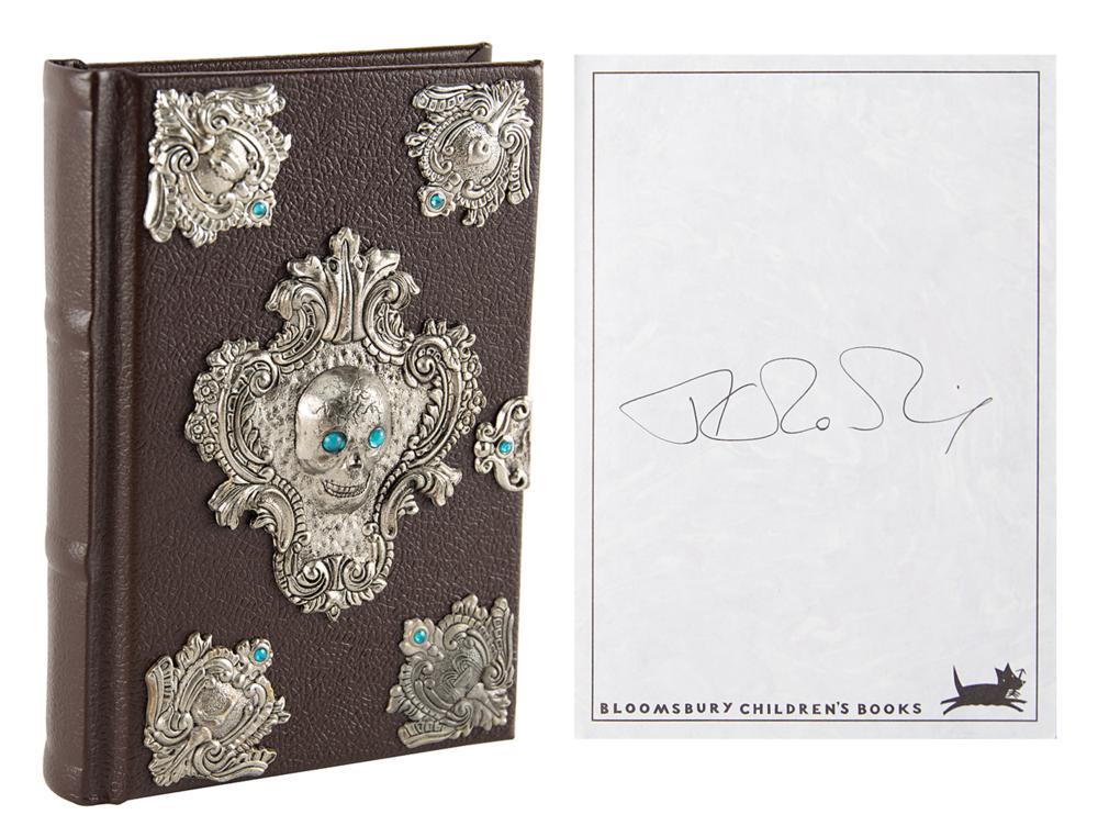 Signed book: The Tales of Beedle the Bard. Deluxe collector's edition. London: Children's High Level Group, 2008. Ornately embellished hardcover, 4.75 x 6.75, 179 pages. Signed by J. K. Rowling in black ink on a bookplate affixed to the first free end page. Complete with its beautiful embroidered velvet bag, illustration prints, and large leather-bound clamshell case with cardstock slipcover. Autographic condition: very fine. Book condition: NF in an NF clamshell case; some slight creasing to the slipcover. A scarce and luxurious edition signed by the Harry Potter author.