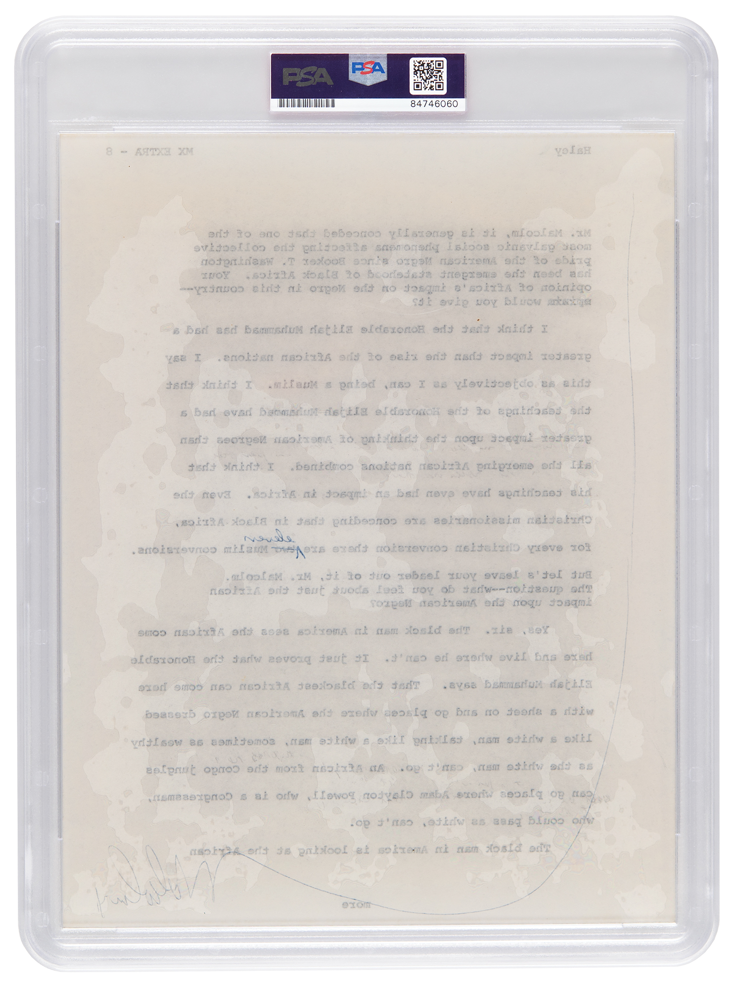 Page marked “MX EXTRA – 8” from the original typescript of Alex Haley’s 1963 interview of Malcolm X for Playboy magazine, one page, 8.5 x 11, signed "Malcolm X" in the bottom margin (with a marginal line indicating his approval of the contents). In full: [Haley] “Mr. Malcolm, it is generally conceded that one of the most galvanic social phenomena affecting the collective pride of the American Negro since Booker T. Washington has been the emergent statehood of Black Africa. Your opinion of Africa's impact on the Negro in this country — would you give it?