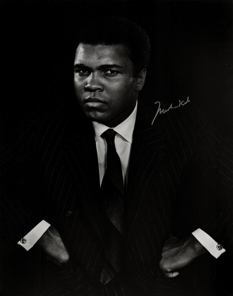 Handsome semi-glossy 15.25 x 19.25 silver gelatin photo of Muhammad Ali taken by renowned portraitist Yousuf Karsh in 1970, signed in silver ink, "Muhammad Ali." In fine condition. A high-quality, signed example of this classic image.