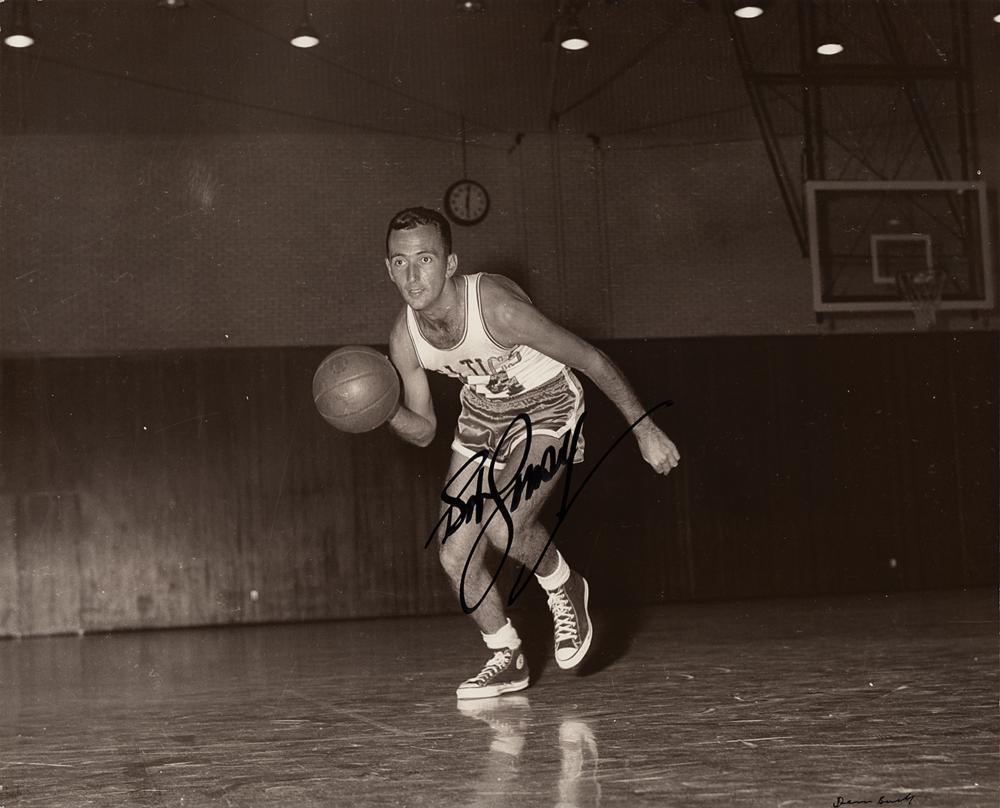Glossy 20 x 16 silver gelatin photo of Bob Cousy, point guard of the Boston Celtics, dribbling the ball on a basketball court, signed in black felt tip. Also signed along the bottom edge in black felt tip by photojournalist Dennis Brearley; reverse bears a 1978 Brearley Collection copyright stamp. In fine condition, with light edge rippling.