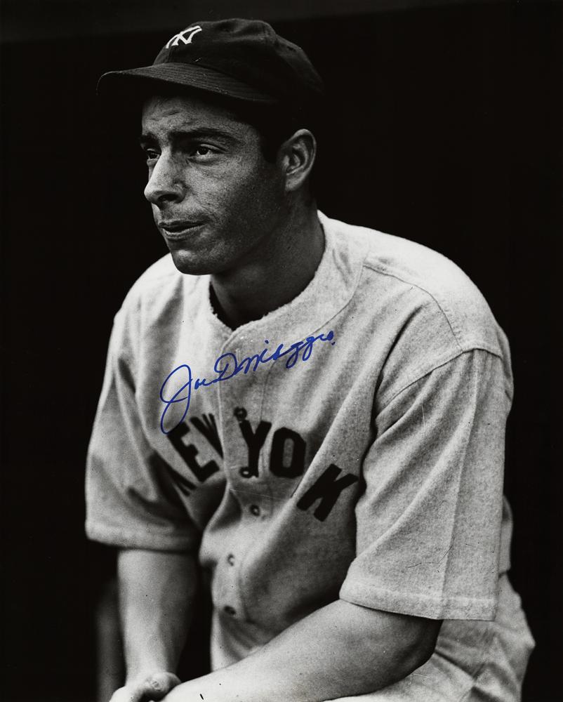 Fantastic satin-finish 16 x 20 head-and-shoulders photo of Joe DiMaggio in his New York Yankees uniform, signed in blue felt tip, "Joe DiMaggio." Reverse bears a 1978 Brearley Collection copyright stamp. In fine condition, with small areas of silvering along the edges.