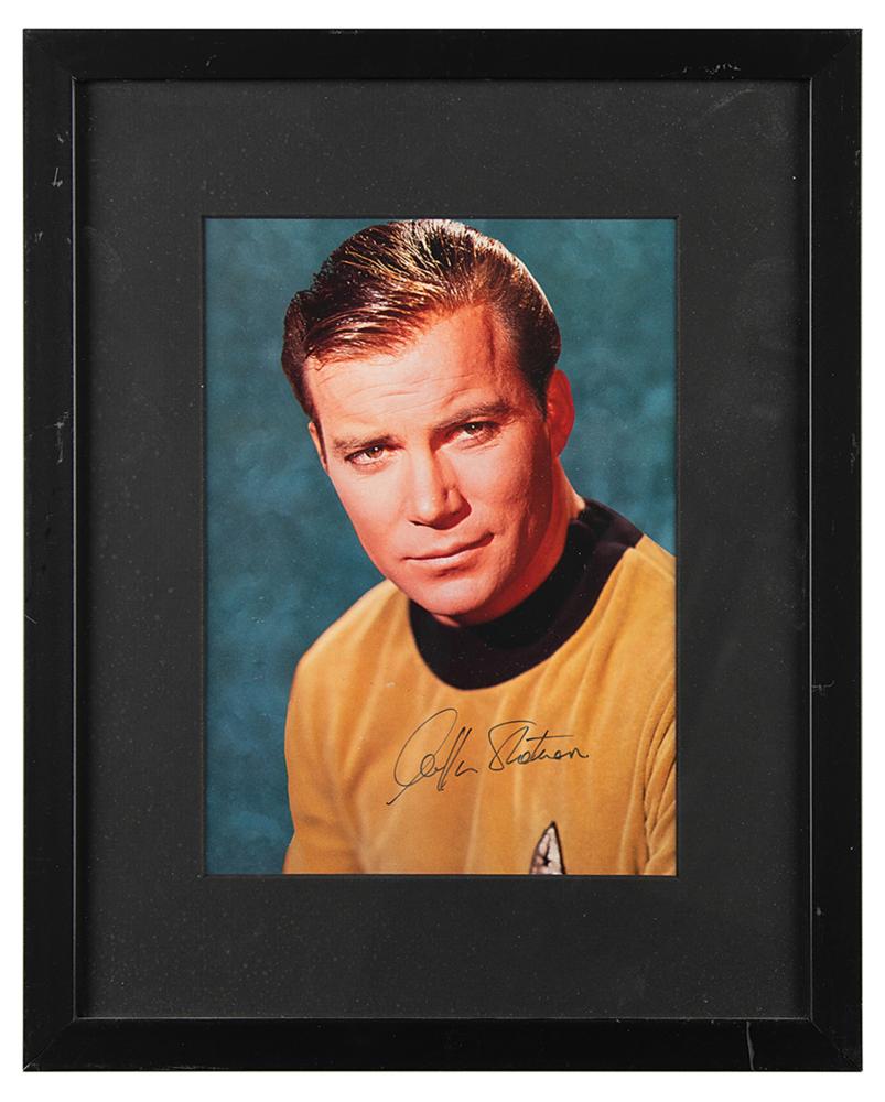 Color semi-glossy 6.75 x 9.5 photo of Captain James T. Kirk from Star Trek, signed in black felt tip by William Shatner. Matted and framed to an overall size of 12.25 x 15. In fine condition.