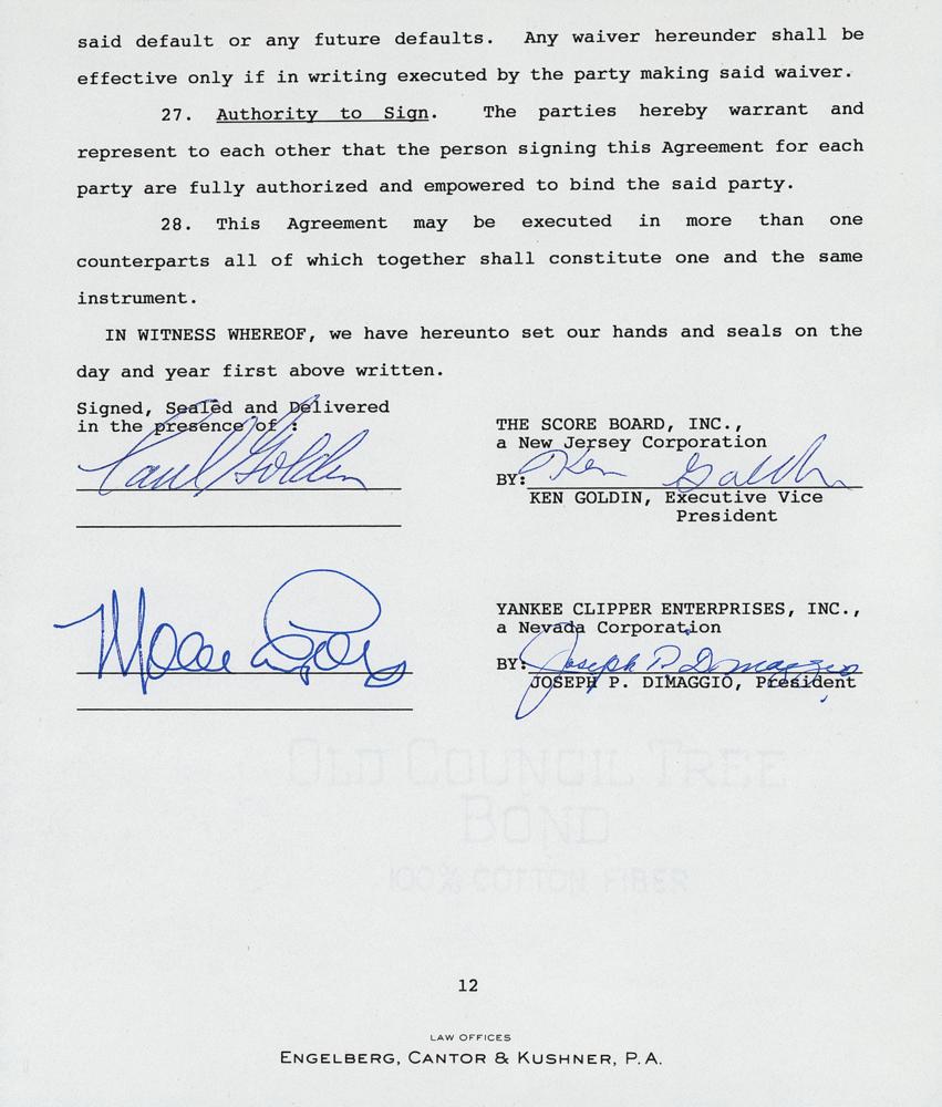 DS, signed “Joseph P. DiMaggio,” twelve pages, 8.5 x 11, October 17, 1991. Agreement between DiMaggio and Score Board "to sign personal autographs on baseballs and photos/flats (limited to 8″ x 10″ and 11″ x 14″), and to appear, at YCE's sole and exclusive option, on Shop-at-Home T.V. Networks." For his efforts in signing 43,200 items during the two-year contract period, DiMaggio is to receive a minimum of $5,940,000. Signed at the conclusion in ink by DiMaggio, Score Board executive Ken Goldin, and two witnesses. In fine condition.