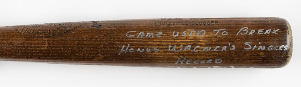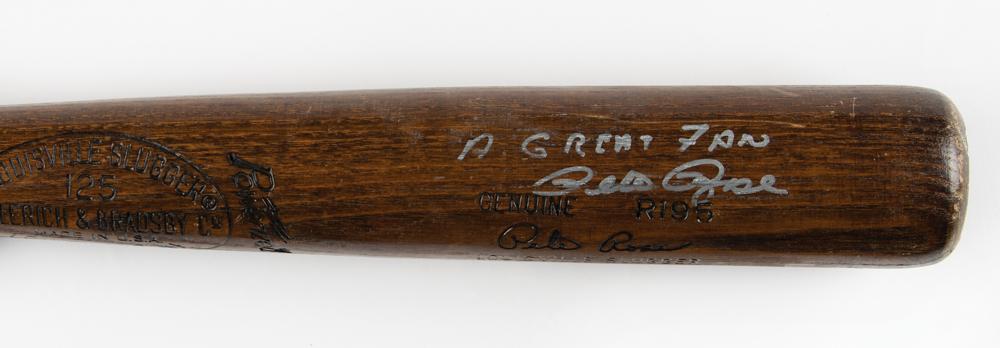 Significant game-used official Hillerich & Bradsby Louisville Slugger 'Pete Rose' signature-model R195 baseball bat, 35 inches and 32 ounces, signed and certified on the barrel in silver ink, "Game Used to Break Honus Wagner's Singles Record, Pete Rose"; also signed and inscribed above, "A great fan, Pete Rose." The uncracked bat is made of top-quality dark-stained white ash with all of the barrel stampings deep and defined. Factory records indicate that this particular model was a favorite of Rose's, as he ordered 35-inch, 32-ounce Louisville Slugger R195 bats throughout the entire 1977-1979 period. In fine condition, exhibiting moderate use including ball and lace marks.