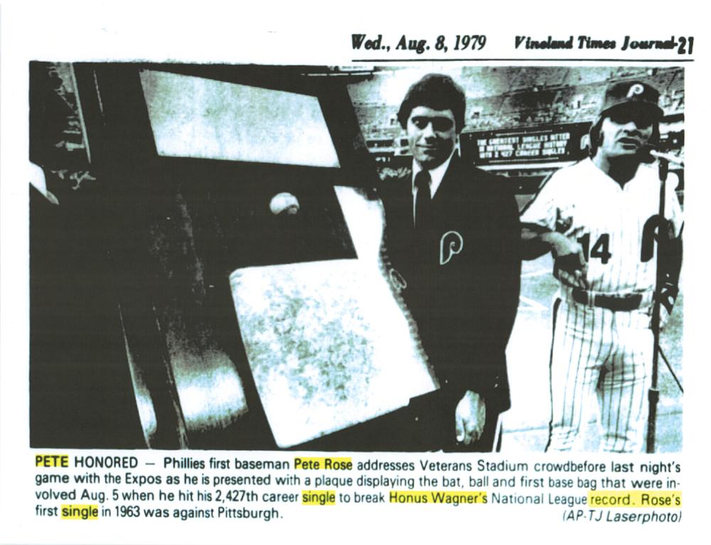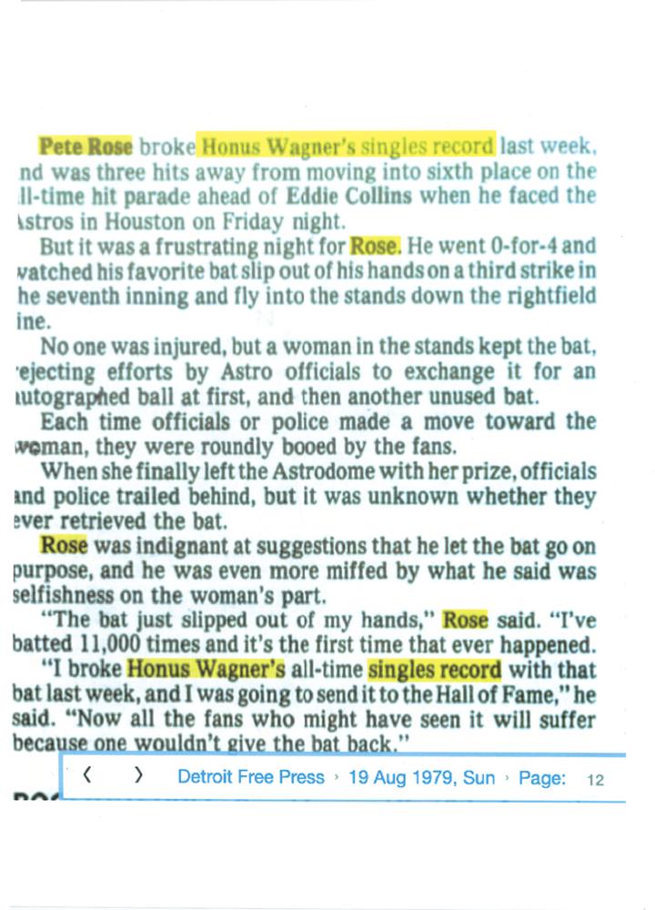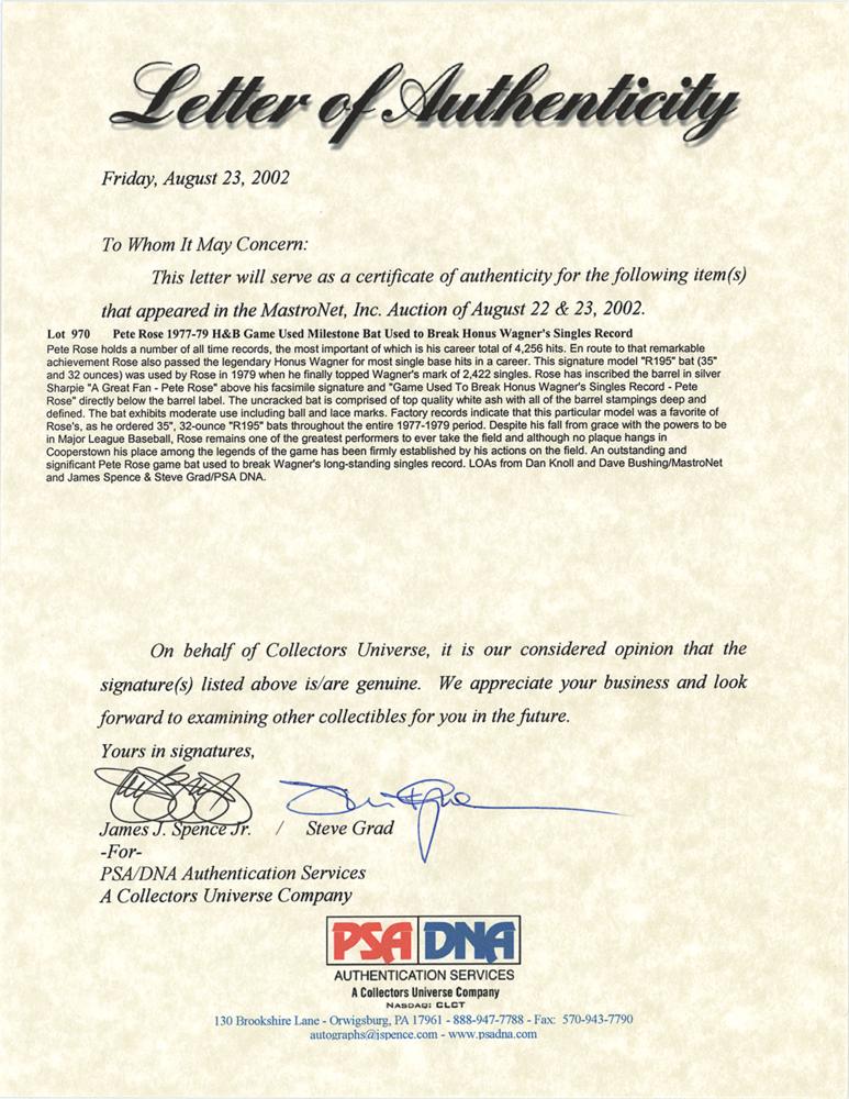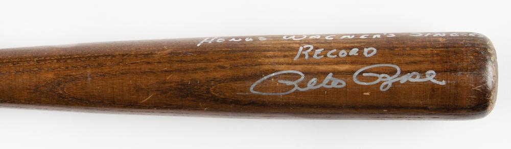 On August 5, 1979, Pete Rose hit his 2,427th single to surpass Honus Wagner's National League record. Three days later, the Philadelphia Phillies held a ceremony to present him with a plaque displaying the bat, ball, and first base bag that were involved in the milestone. Rose continued to use the bat, however, and planned to send it to the National Baseball Hall of Fame and Museum. In an incident in Houston on the night of August 17th, he accidentally lost the bat into the stands on a swing. The Associated Press reported: "It was a frustrating night for Rose. He went 0-for-4 and watched his favorite bat slip out of his hands on a third strike in the seventh inning and fly into the stands down the right field line. No one was injured, but a woman in the stands kept the bat, rejecting efforts by Astros officials to exchange it?Rose was indignant at suggestions that he let the bat go on purpose, and he was even more miffed by what he said was selfishness on the woman's part. 'The bat just slipped out of my hands,' Rose said. 'I've batted 11,000 times and it's the first time that ever happened. I broke Honus Wagner's all-time singles record with that bat last week, and I was going to send it to the Hall of Fame.'" Rose evidently forgave the fan, later inscribing the bat with a proud confirmation of his milestone moment.