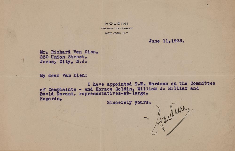TLS signed “Houdini,” one page, 8.5 x 5.5, personal letterhead, June 11, 1923. Fantastic letter to Richard Van Dien, former president of the Society of American Magicians (S.A.M.), referencing several fellow magicians. In full: "I have appointed T.W. Hardeen on the Committee of Complaints—and Horace Goldin, William J. Hilliar and David Devant, representatives-at-large." In fine condition. Van Dien served as president of the S.A.M. from 1915 to 1917, when Houdini succeeded him in the role. Houdini would serve as national president of the society until 1926.