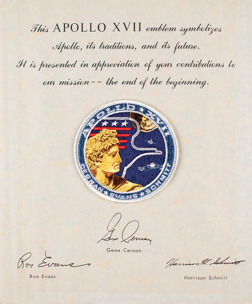 Desirable Apollo 17 patch presentation from the collection of Otto Berg, featuring a 4″ diameter embroidered mission patch affixed to a 10 x 12 certificate, reading: "This Apollo XVII emblem symbolizes Apollo, its traditions, and its future. It is presented in appreciation of your contributions to our mission—the end of the beginning." Facsimile signatures of the three Apollo 17 crewmen are printed below. In very good to fine condition, with overall foxing to the parchment certificate, a light block of toning from prior display, and a spot of adhesive residue to one corner. Berg's Lunar Ejecta and Meteorites (LEAM) experiment was carried on Apollo 17 and deployed on the lunar surface during the mission.
