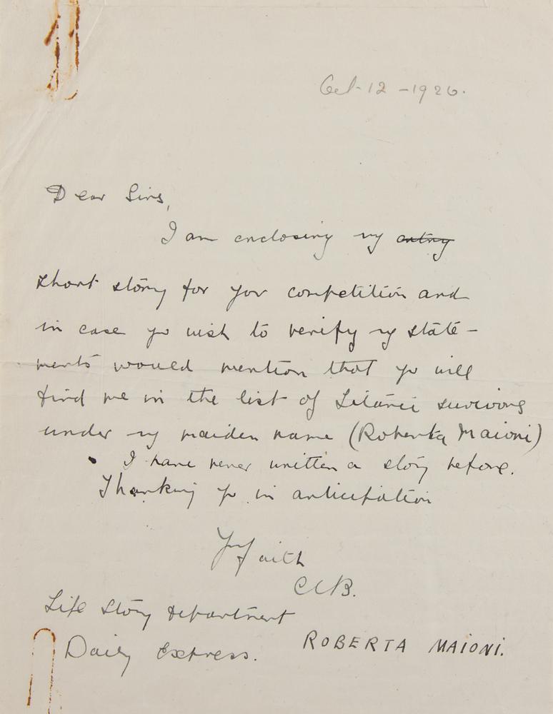 Roberta Elizabeth Mary Maioni (1891-1963), known as 'Cissy' to friends and family, was traveling as a first-class passenger on the Titanic in her capacity as personal maid to the Countess of Rothes, boarding at Southampton; she later married Yorkshire businessman Cunliffe Bolling in 1919. ALS signed "C.E.B." and "Roberta Maioni," one page, 6.75 x 9, October 12, 1926. Handwritten cover letter to the "Life Story Department, Daily Express," in full: "I am enclosing my short story for your competition and in case you wish to verify my statements would mention that you will find me in the list of Titanic survivors under my maiden name (Roberta Maioni). I have never written a story before." Includes her typed manuscript of the story, seven pages, 8 x 10, beginning: "When I say that I am a survivor of the Titanic you will know at once that my story is to be one of a great tragedy, for even after fourteen years the name of that ill-fated vessel brings a shudder of horror to those who remember its wreck."