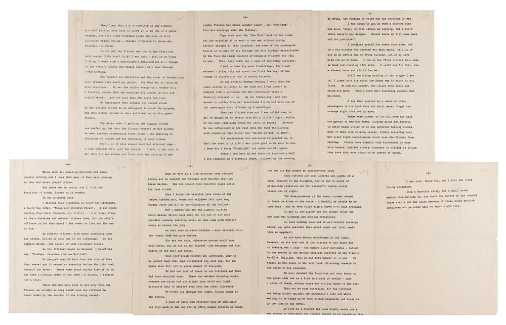 She continues to offer a first-person account of the iceberg strike and her escape from disaster: "After I had been in bed about an hour and a half I was awakened by a terrific crash, followed by the rending of metal, the rushing of water and the shouting of men…I watched them preparing to lower the lifeboats. I heard the order, 'Women and children first.' I saw women parting from their husbands and fathers. Some women clung to their husbands and refused to leave them, but the ship's officers pulled them apart—the women to live and the men to die. An elderly officer, with tears streaming down his cheeks, helped us into one of the lifeboats. He was Captain Smith—the master of that ill-fated vessel. As the lifeboat began to descend, I heard him say, 'Goodbye, remember you are British.'" She goes on to recount watching the ship sink, their rescue by the Carpathia, and offers praise for "the quiet bravery of those noble British gentlemen who perished that we women might live." In very good to fine condition, with some light creasing, and rusty paperclip impression. The story would be published in the Daily Express under the title 'My Maiden Voyage.'