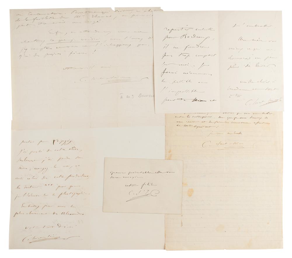 Group lot of five ALSs in French from esteemed Romantic composer Camille Saint-Saens, signed “C. Saint-Saens” or “C. St. S.,” total of 11 handwritten pages, with selected passages as follows (partially translated):