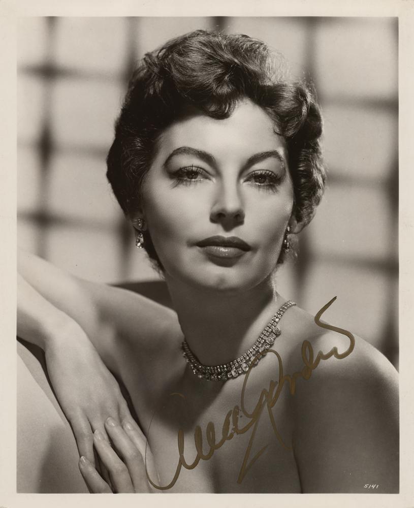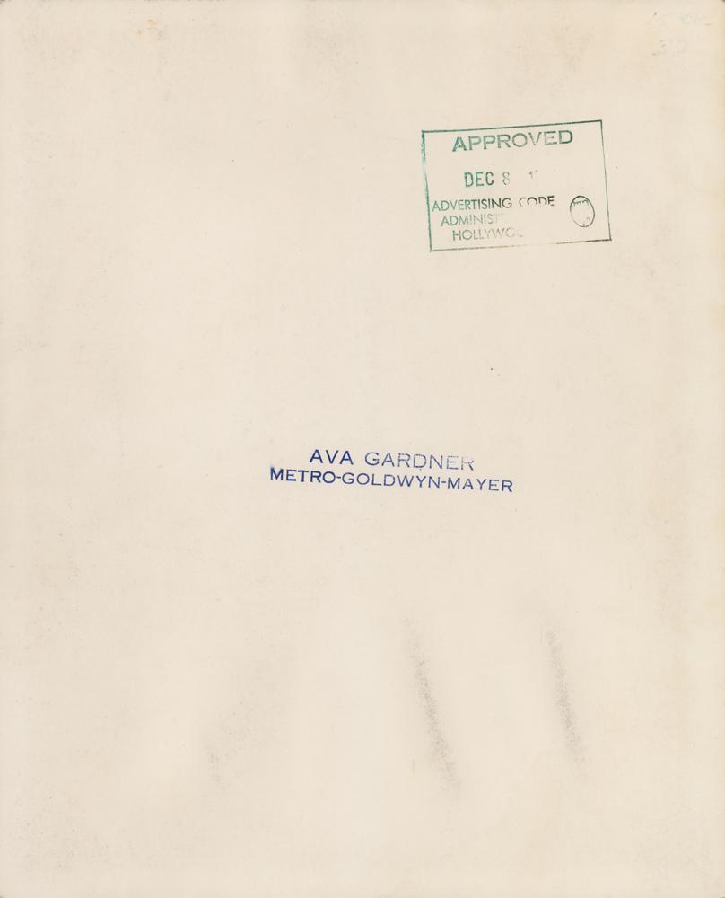 Magnificent glossy 8 x 10 MGM publicity photo of Ava Gardner, signed in gold ink. Reverse bears "Metro-Goldwyn-Mayer" and "Advertising Code Approval" stamps. In very good to fine condition, with light rippling, small creases, and a faint diagonal bend impinging on her right eye.