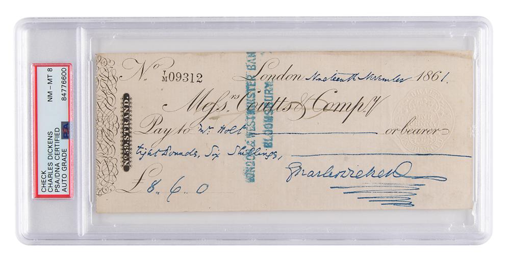 Coutts & Company bank check, 7.5 x 3.25, filled out and signed by Charles Dickens, payable to Mr. Holt for £8.6, November 19, 1861. In fine condition. Encapsulated and graded by PSA/DNA as "NM-MT 8."
