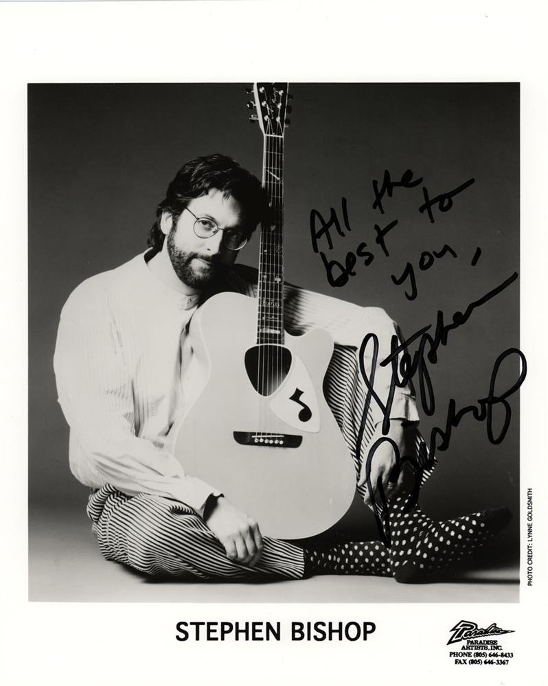 Satin-finish 8 x 10 publicity photo of Stephen Bishop seated with his guitar, signed in black felt tip, "All the best to you, Stephen Bishop." In fine condition.