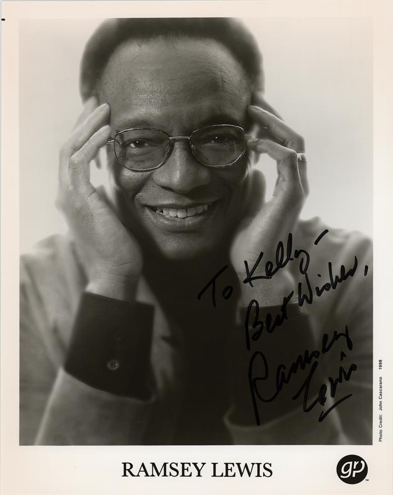 Satin-finish 8 x 10 publicity photo of the Grammy-winning jazz pianist from circa 1998, signed and inscribed in black felt tip, "To Kelly—Best wishes, Ramsey Lewis.” In fine condition.