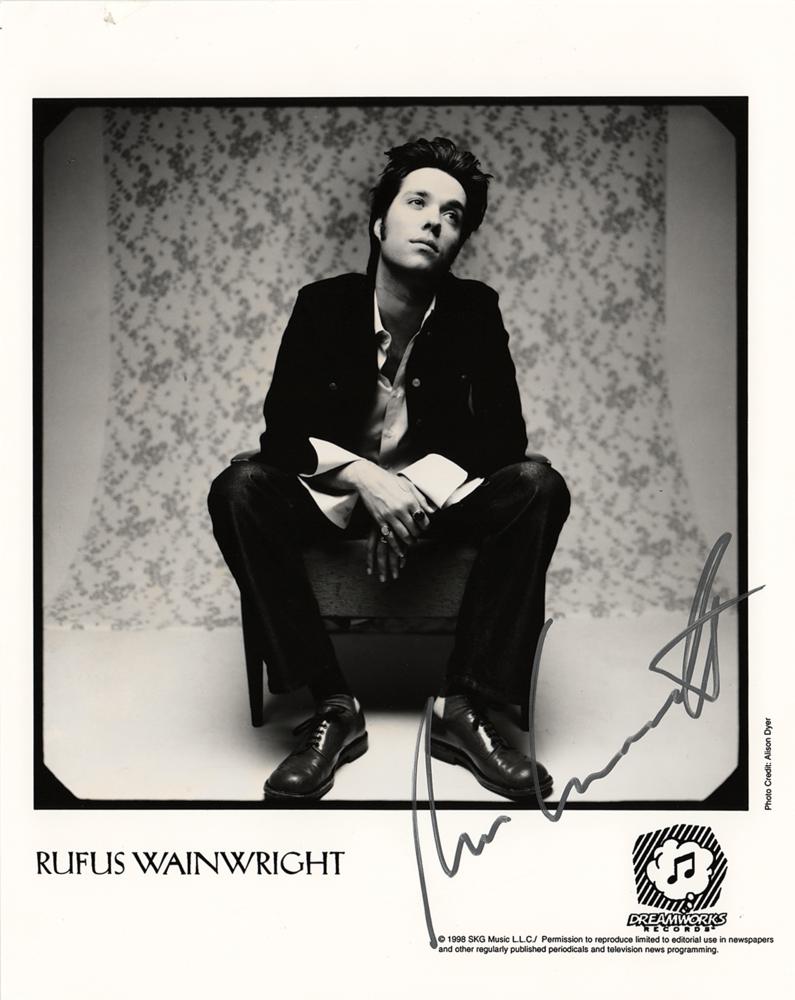 Satin-finish 8 x 10 Dreamworks Records publicity photo Rufus Wainwright for his self-titled debut album from circa 1998, signed in silver ink. In fine condition, with a small piece of tape on the top edge.