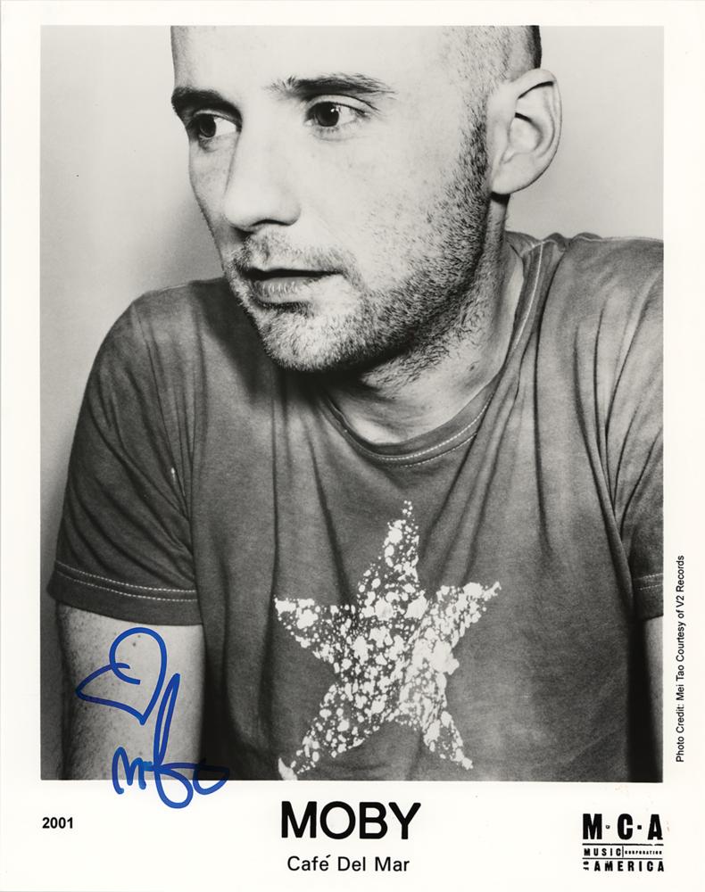 Satin-finish 8 x 10 MCA Music publicity photo of Moby for Cafe del Mar, signed in blue felt tip. In fine condition, with a couple very faint bends to left side.