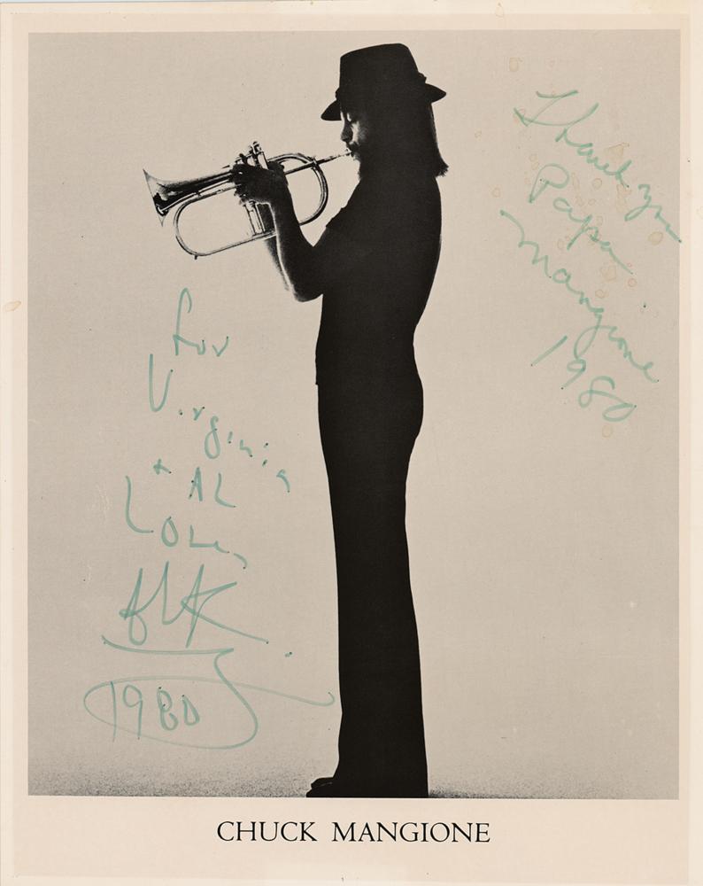 Glossy 8 x 10 lightweight publicity photo of Chuck Mangione playing his flugelhorn in a great standing profile pose, signed and inscribed in black felt tip, "For Virginia + Al, Love, Chuck, 1980.” The photo is also signed by his father, Papa Mangione. In fine condition.