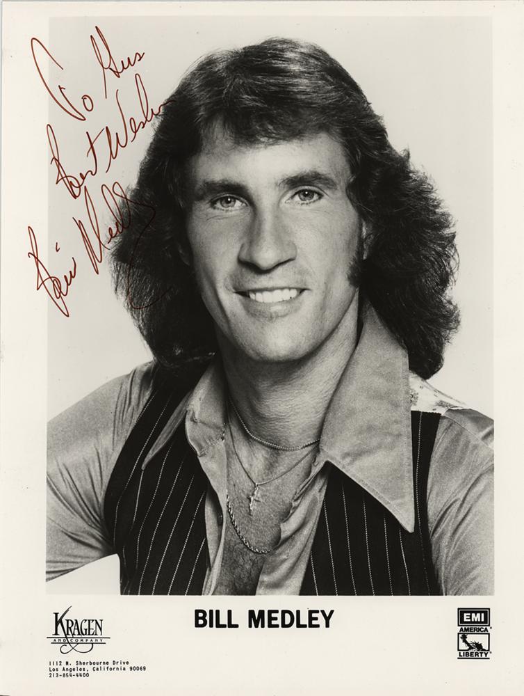 Glossy 7.75 x 10 EMI Records publicity photo of Medley in a handsome front-facing pose, signed and inscribed in brown felt tip, "To Gus, Best wishes, Bill Medley.” In fine condition.