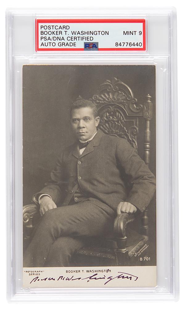 Vintage matte-finish 3.25 x 5.5 postcard photo of Booker T. Washington by the Rotograph Co. of New York City, signed nicely in the lower border in black ink. In very fine condition. Encapsulated and graded by PSA/DNA as "MINT 9.”
