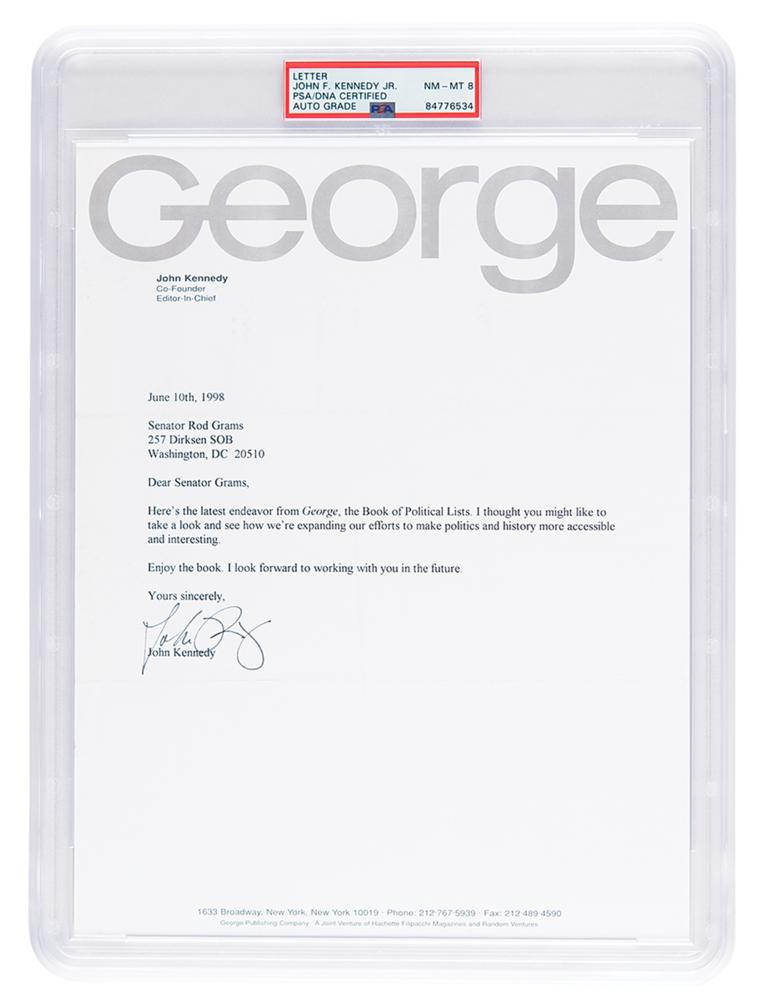 TLS signed “John Kennedy,” one page, 8.5 x 11, George letterhead, June 10, 1998. Letter to Senator Rod Grams, in full: "Here's the latest endeavor from George, the Book of Political Lists. I thought you might like to take a look and see how we're expanding our efforts to make politics and history more accessible and interesting. Enjoy the book. I look forward to working with you in the future." In fine condition. Encapsulated and graded by PSA/DNA as "NM-MT 8."