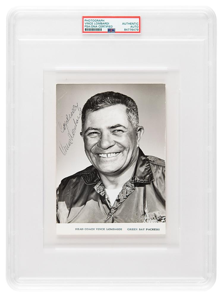 Vintage glossy 5 x 7 publicity photo of the legendary head coach of the Green Bay Packers, signed in black ballpoint, "Cordially, Vince Lombardi." In fine condition. Encapsulated in a PSA/DNA authentication holder.