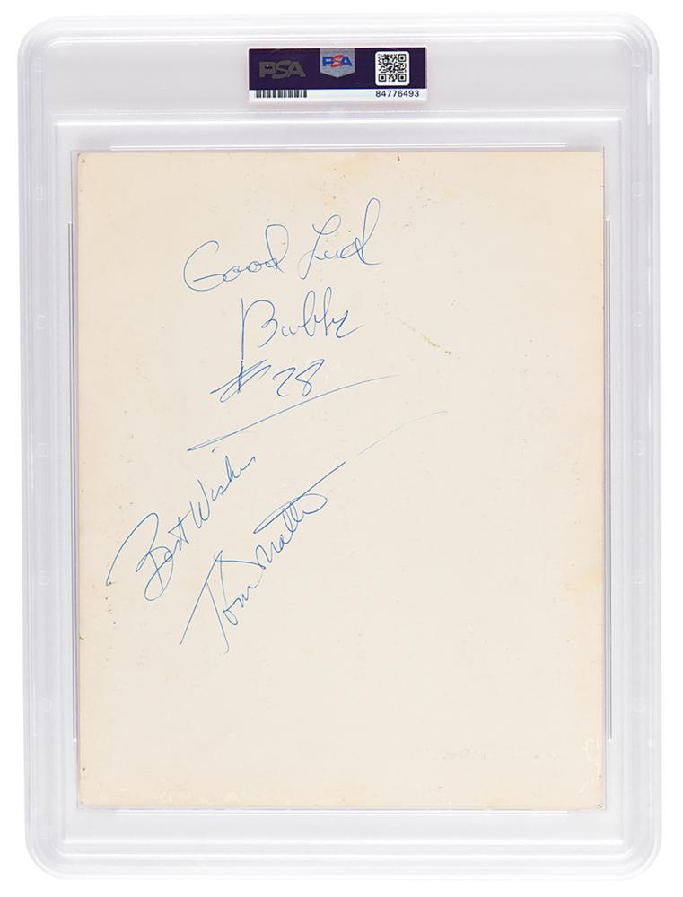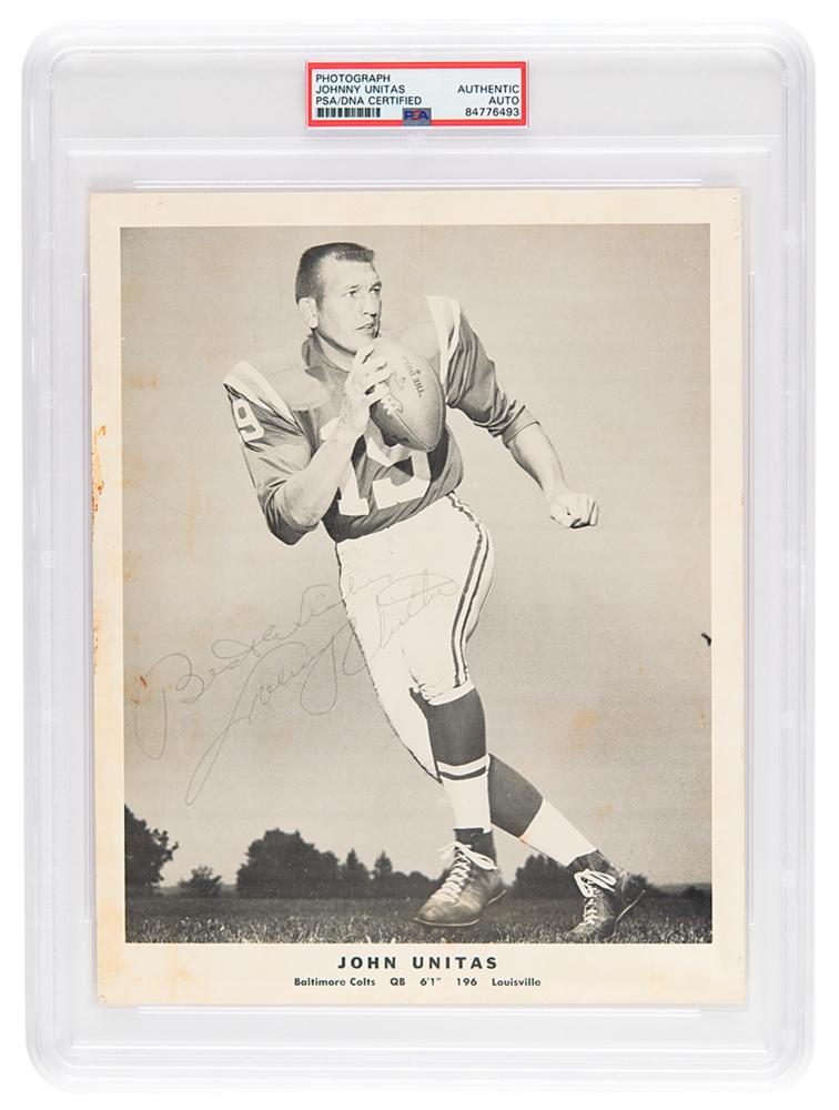 Vintage semi-glossy 8 x 10 publicity photo of quarterback Johnny Unitas in his Baltimore Colts uniform, signed in black ballpoint, "Best wishes, Johnny Unitas." Reverse is signed by Bubba Smith and Tom Matte. In very good to fine condition, with light creasing and staining, and surface impressions from the signatures on the back. Encapsulated in a PSA/DNA authentication holder.