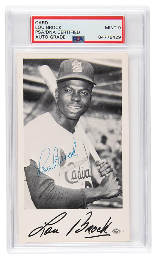 Glossy 3.25 x 5.5 publicity photo of Lou Brock in his St. Louis Cardinals uniform, signed in blue ballpoint. Lower border bears a preprinted autograph. In fine condition. Encapsulated and graded by PSA/DNA as "MINT 9."