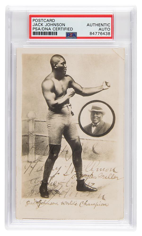 Vintage pearl-finish 3.5 x 5.5 postcard photo of the great heavyweight boxer in a full-length pose next to a floating headshot image of Johnson in formal attire, signed and inscribed in fountain pen, "To my pal, Harry Hellmon & Frank Miller, all the best, Jack Johnson.” In very good to fine condition, with a crease to the upper right corner tip, and light silvering to the darker areas of the image. Encapsulated in a PSA/DNA authentication holder.