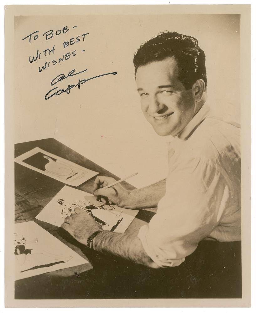 Vintage 8 x 10 photo of Capp seated at his sketching table, signed and inscribed in fountain pen, "To Bob—with best wishes—Al Capp." In very good to fine condition, with scattered light creasing and surface impressions.