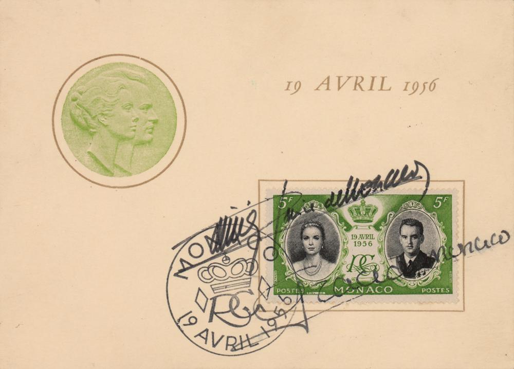 Vintage ink signatures, "Grace de Monaco" and "Rainier, Prince de Monaco," over an official Monaco postage stamp affixed to a 5.5 x 4 card commemorating their wedding on April 19, 1956. In fine condition.