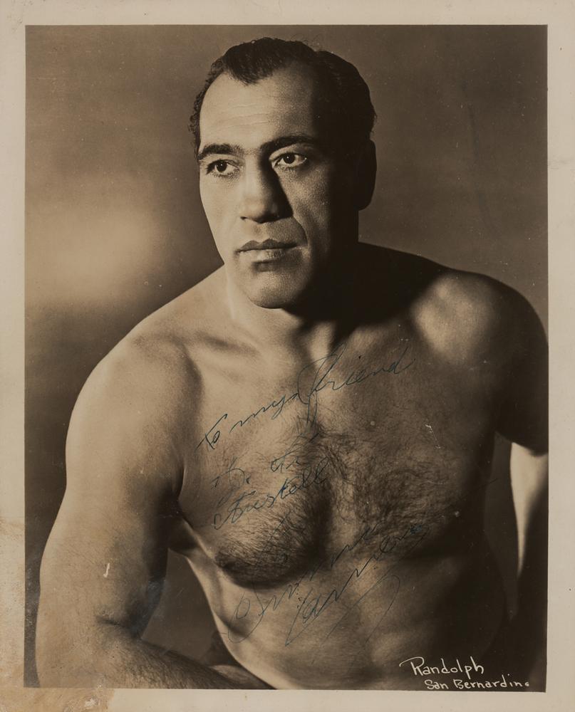 Vintage glossy 8 x 10 photo of the shirtless Italian heavyweight by Randolph of San Bernardino, signed and inscribed in fountain pen, "To my friend?Primo Carnera.” In very good to fine condition, with scattered light creasing, a short tear to the top edge, and staining to the lower left corners area.