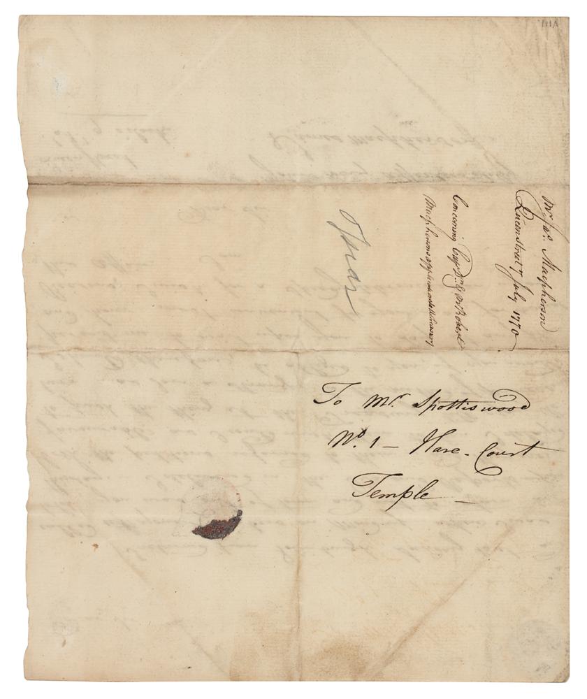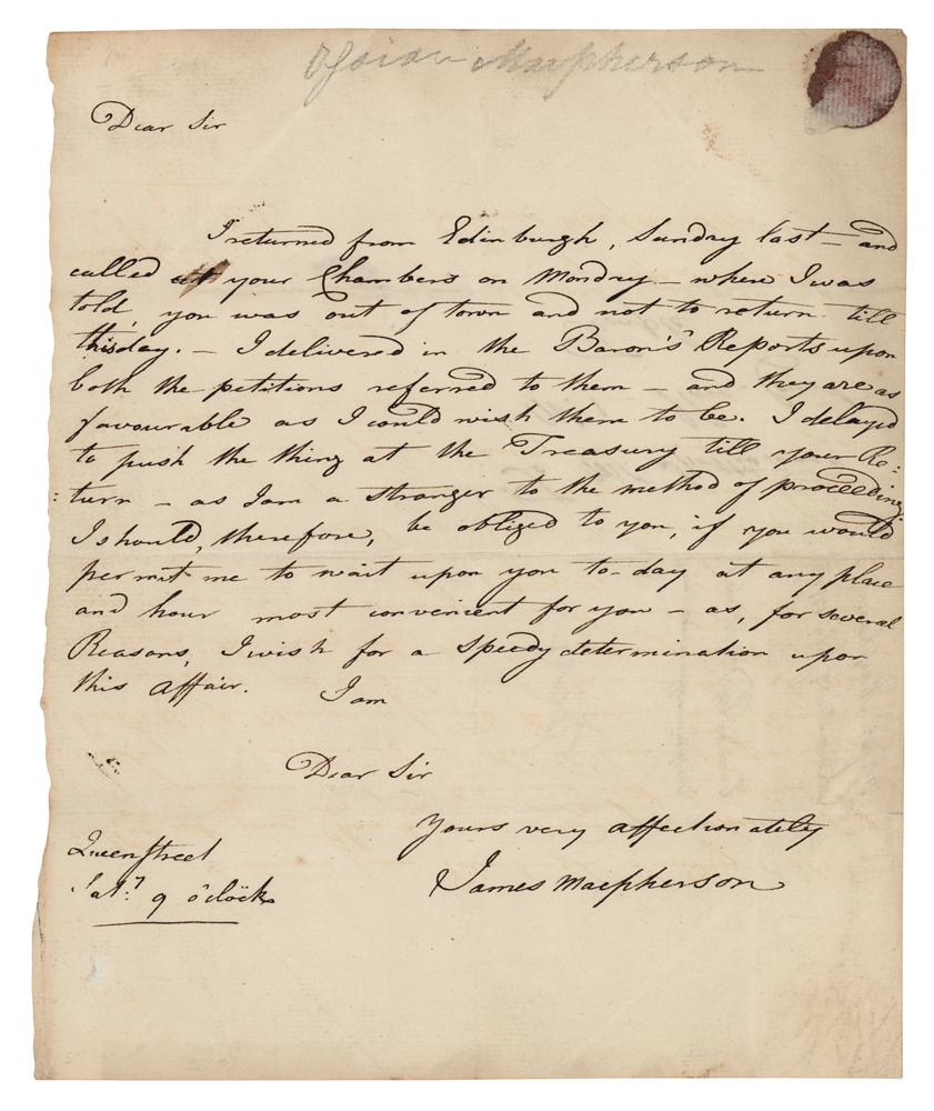 Scottish writer, poet, literary collector, and politician (1736-1796) best known as the 'translator' of the Ossian cycle of epic poems. Macpherson’s 'translations' from the Gaelic bard Ossian were first published in 1761, and their authenticity was immediately challenged—most famously by Dr. Samuel Johnson. ALS, one page, 7.25 x 9, no date but docketed July 7, 1770. Handwritten letter to Mr. Spottiswood, asking for advice on how to proceed with two petitions to the Treasury. In part: "I returned from Edinburgh, Sunday last, and called at your Chambers on Monday—where I was told, you was out of town and not to return till this day. I delivered in the Baron's Reports upon both the petitions referred to them—and they are as favorable as I could wish them to be. I delayed to push the thing at the Treasury till your return—I am a stranger to the method of proceeding." In fine condition.