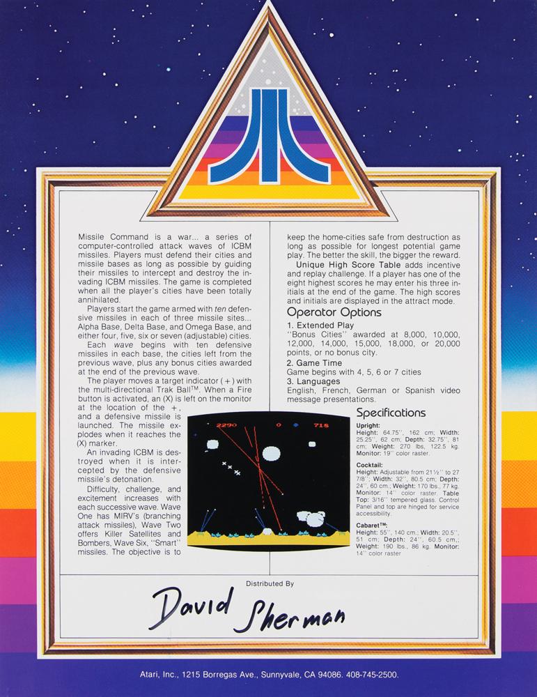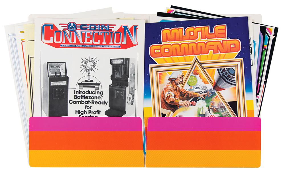 Rare Atari, Inc. promotional packet for the classic shoot 'em up arcade video game Missile Command, deriving from the personal collection of Atari hardware designer David Sherman. The packet consists of its attractive 9 x 12 Atari logo folder, which contains promotional color glossy 8.5 x 11 information pamphlets and sheets for Missile Command (signed on the back cover by Sherman), Asteroids, Asteroids: Cocktail, Battlezone, Monte Carlo, and Atari 4 Player Football. Also included is a Coin Connection newsletter from October 1980, an Atari distributor list, an Atari mailing list form, a helpful tip sheet entitled “How to Increase Your Missile Command Earnings,” and a background sheet entitled “Atari Story.” In overall fine condition.