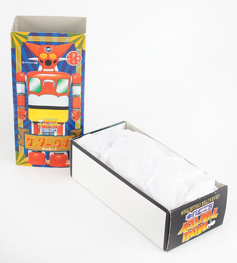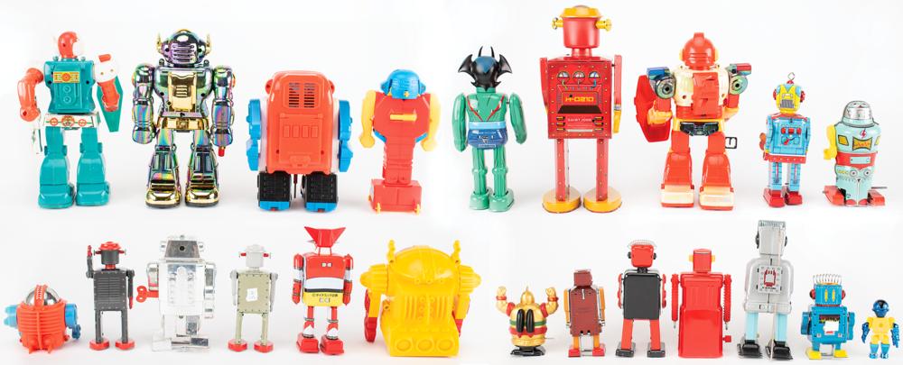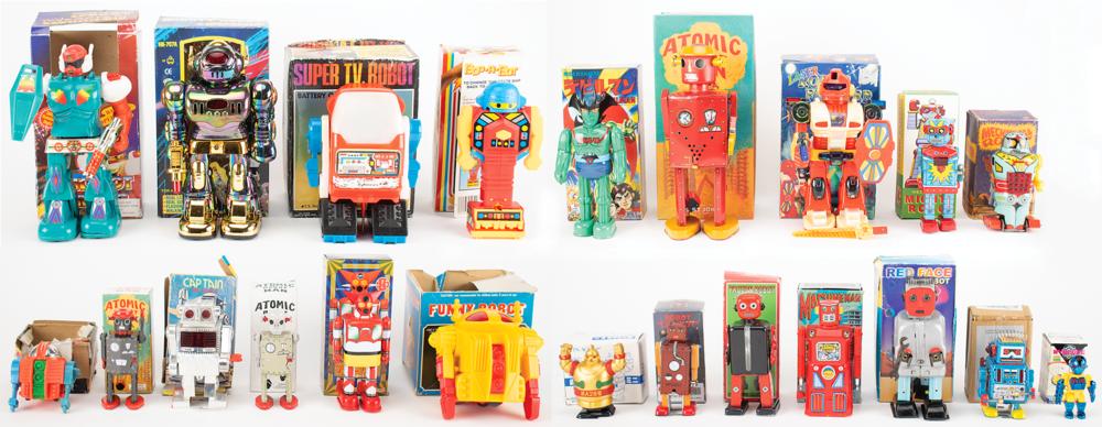 Huge lot of 22 vintage circa 1960s-2000s boxed robots, ranging in height from 2.5″ to 11.5″, mostly comprised of wind-up tin litho mechanical robots with a few plastic battery-operated examples. Highlights include a vintage "Mechanical Robot" wind-up toy made in Greece, a "Captain the Robot" clockwork robot made in Hong Kong (box flattened), a Billiken Shokai Mechanical "Devilman" made in Japan, a Marmit Character Collection "Robo Getter" mini wind-up walking robot, and three modern versions of "The Atomic Man," ranging in height from 5″ to 11.5″. Others include a "Laser Robot Fighter" made in China, a "Tumbling Space Warrer" (box damaged), a battery-operated "Funny Robot" made in Hong Kong (box lid damaged), a Robot Island "Mechanical Mighty Robot" made in China, battery-operated "HK-707A Mighty Robot Sonic," battery-operated "Super TV Robot," an F. J. Strauss "Bop-a-Bot," a battery-operated "Robot Warrior," and seven very small boxed robot toys including "Proton Robot" and "Robot Liliput."