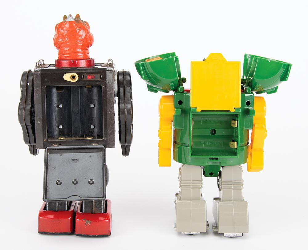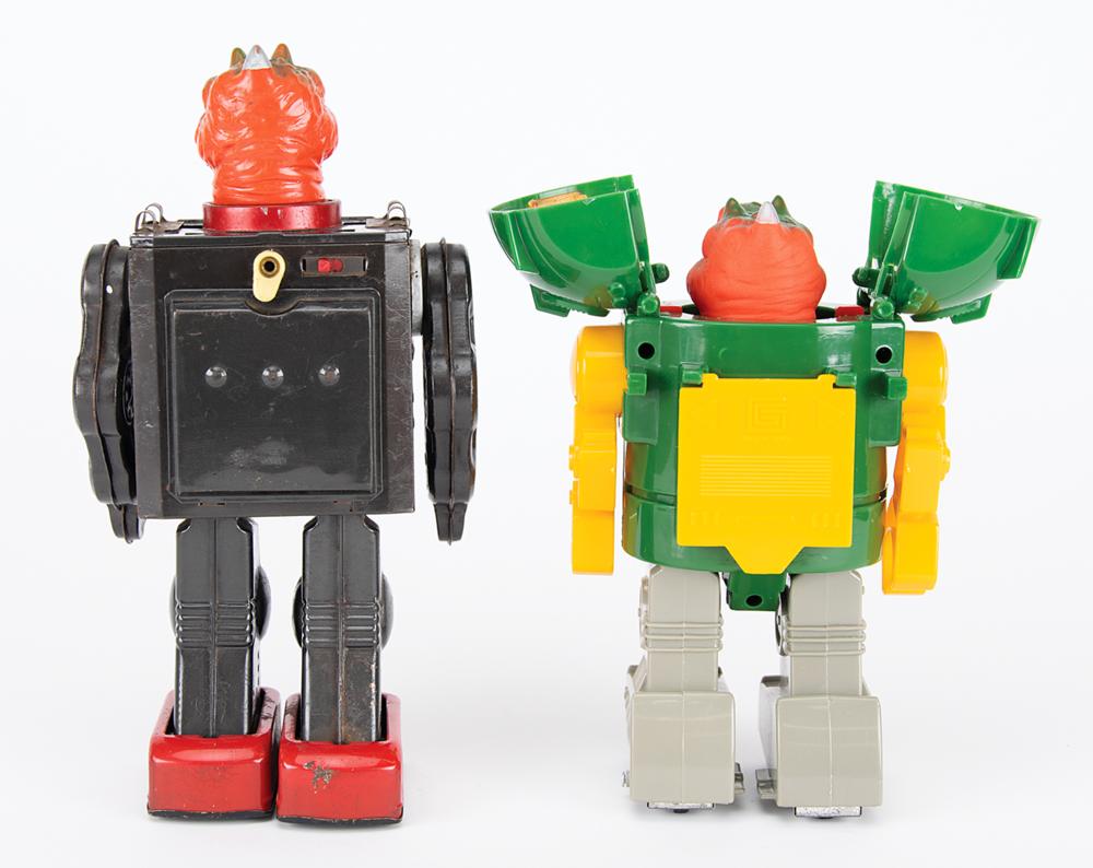 Two fantastic vintage battery-operated Dino robots: a classic vintage circa 1960s-70s battery-operated "Dino-Robot" with black tin body and red feet and lightbulb in its monster mouth, made in Japan by Horikawa, standing at 11″ tall (missing its robot head shoulder flaps); and a later "Monster Robot" in a similar style with green-and-yellow plastic body, made in Taiwan, standing at 9″ tall.