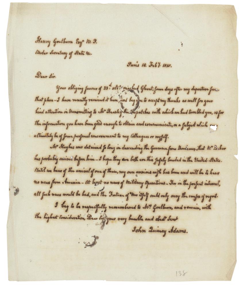 Rare original press copy of an ALS by John Quincy Adams, one page, 7.5 x 9, February 15, 1815, addressed from Paris and sent to Under Secretary of State Henry Goulburn, referencing his departure from Ghent, where he had just negotiated the treaty that ended the War of 1812. In part: "Your obliging favour of 23d ulto. reached Ghent, some days after my departure from that place. I have recently received it here, and beg you to accept my thanks as well for your kind attention in transmitting to Mr. Beasley the dispatches with which we had troubled you, as for the information you have been good enough to obtain and communicate, on a subject which ultimately be of some personal concernment to colleagues and myself. Mr. Hughes was detained so long in descending the Garonne from Bordeaux, that Mr. Baker has probably arrived before him. I hope they are both ere this safely landed in the United States. Until we hear of the arrival of one of them, my own anxious wish has been and will be to hear no news from America. At least no news of military operations. For in the present interval, all such news would be bad, and the Fortune of War itself could only vary the causes of regret." In very good to fine condition, with scattered small areas of paper loss due to ink erosion. Christopher Hughes and Anthony St. John Baker were American and British secretaries to their respective legations during the Treaty of Ghent peace negotiations.