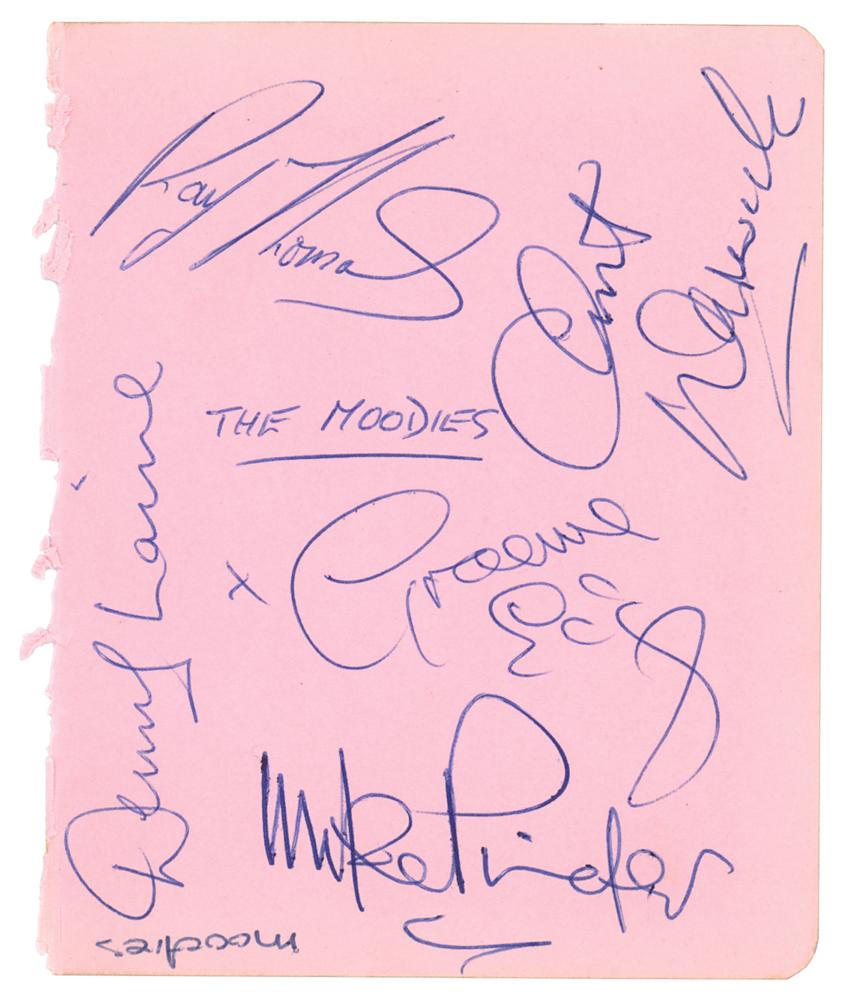 Ballpoint signatures of the Moody Blues—Graeme Edge, Ray Thomas, Mike Pinder, Denny Laine, and Clint Warwick—on a pink 3.75 x 4.5 album page. In fine condition.